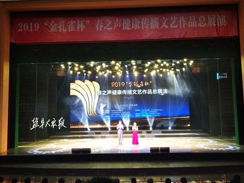 缤纷五月,花香四溢;健康中国,文艺伴行。5月10日14:00,由中国健康促进与教育协会主办,省健康教育协会、亭湖区人民政府、市卫生健康委员会、盐阜大众报报业集团联合主办的2019“金孔雀杯”春之声健康传播文艺作品总展演暨颁奖典礼在亭湖区文化艺术中心拉开帷幕。盐阜大众报报业集团全媒体记者赵伟伟