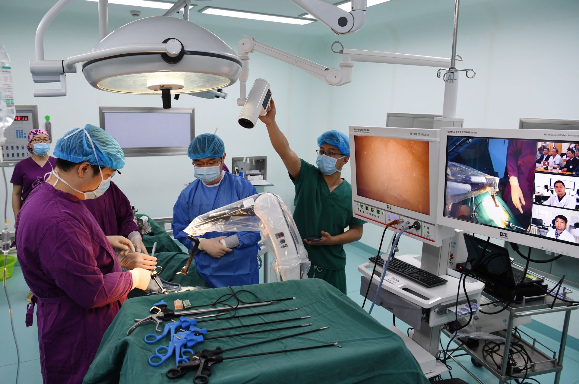5月10日,安徽医科大学第二附属医院专家通过5G远程协同操作平台为石台县人民医院开展的腔镜手术进行指导。新华社记者刘军喜摄