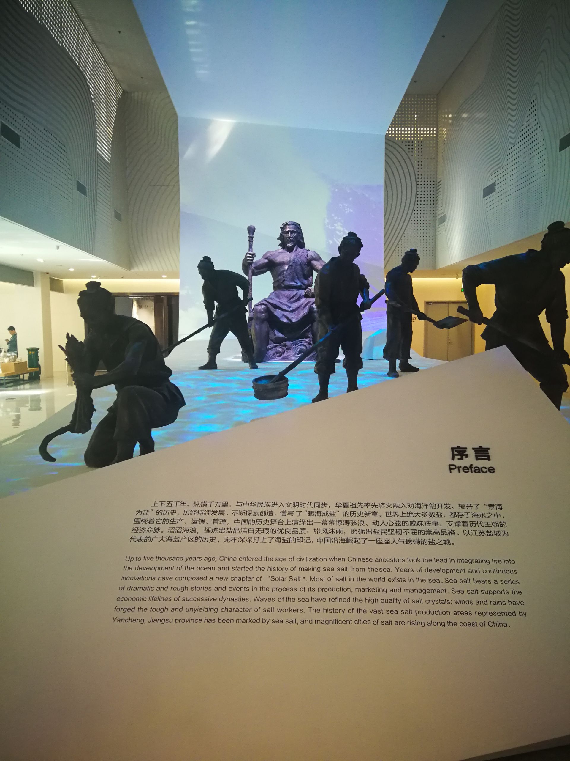 以新“容颜”迎接公众的中国海盐博物馆,由基本陈列“海盐华章”和两个专题陈列组成。一走进博物馆,现代气息与古代文明交融的序厅欢迎着观众。在这里,“走近海盐”视频和遒劲有力的“煮海熬波”雕塑带领大家感受海盐的前世今生。第一部分《引海制盐》讲述海盐生产技术的演变,第二部分《行盐四方》讲述海盐存储、运输和销售管理体系,第三部分《盐政春秋》讲述海盐专卖制度和盐法体系的形成与发展,第四部分《海盐兴城》讲述中国海盐文化凝练的典型代表——盐城。两个专题陈列为《煮海之歌》《环海盐趣》,反映多样的海盐文化和世界盐业奇闻轶事,集中展示中国海盐文化的优秀成果和时代风采。盐阜大众报报业集团全媒体记者 韩宝贵 摄