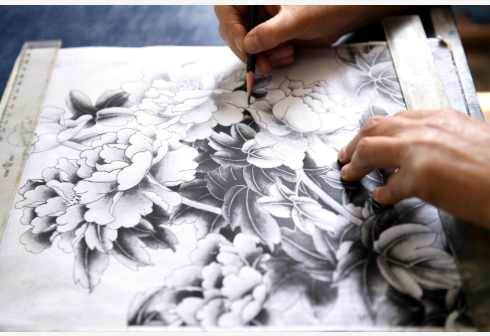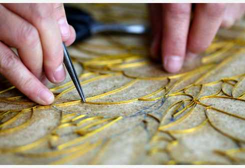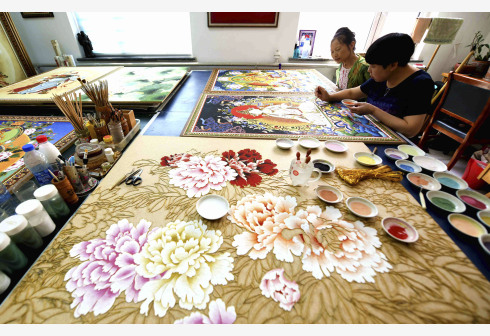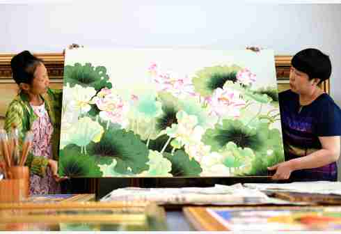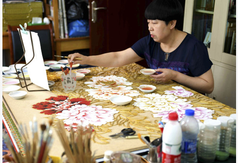 5月31日,在石家庄市裕华区,非遗传承人王玉萍(右)在工作室进行金丝彩釉点蓝工序。点蓝是将各种矿物颜料通过粘合剂粘到木板上。“金丝彩釉工艺”是河北省级非物质文化遗产项目,技法脱胎于景泰蓝制作工艺。主要工序有拓图、掐丝、点蓝、上光等。金丝彩釉艺人将金色的金属丝作为绘画的线条,把各种天然的矿物颜料研磨成的细粉作为颜料,在木板上创作成画作。一幅作品常常需要数月甚至数年的时间才能完成。新华社 发(陈其保 摄)
