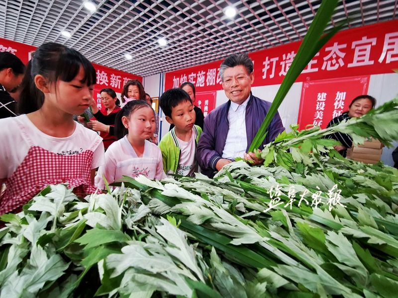 社区关工委主任徐国华教孩子们辨识菖蒲和艾草。