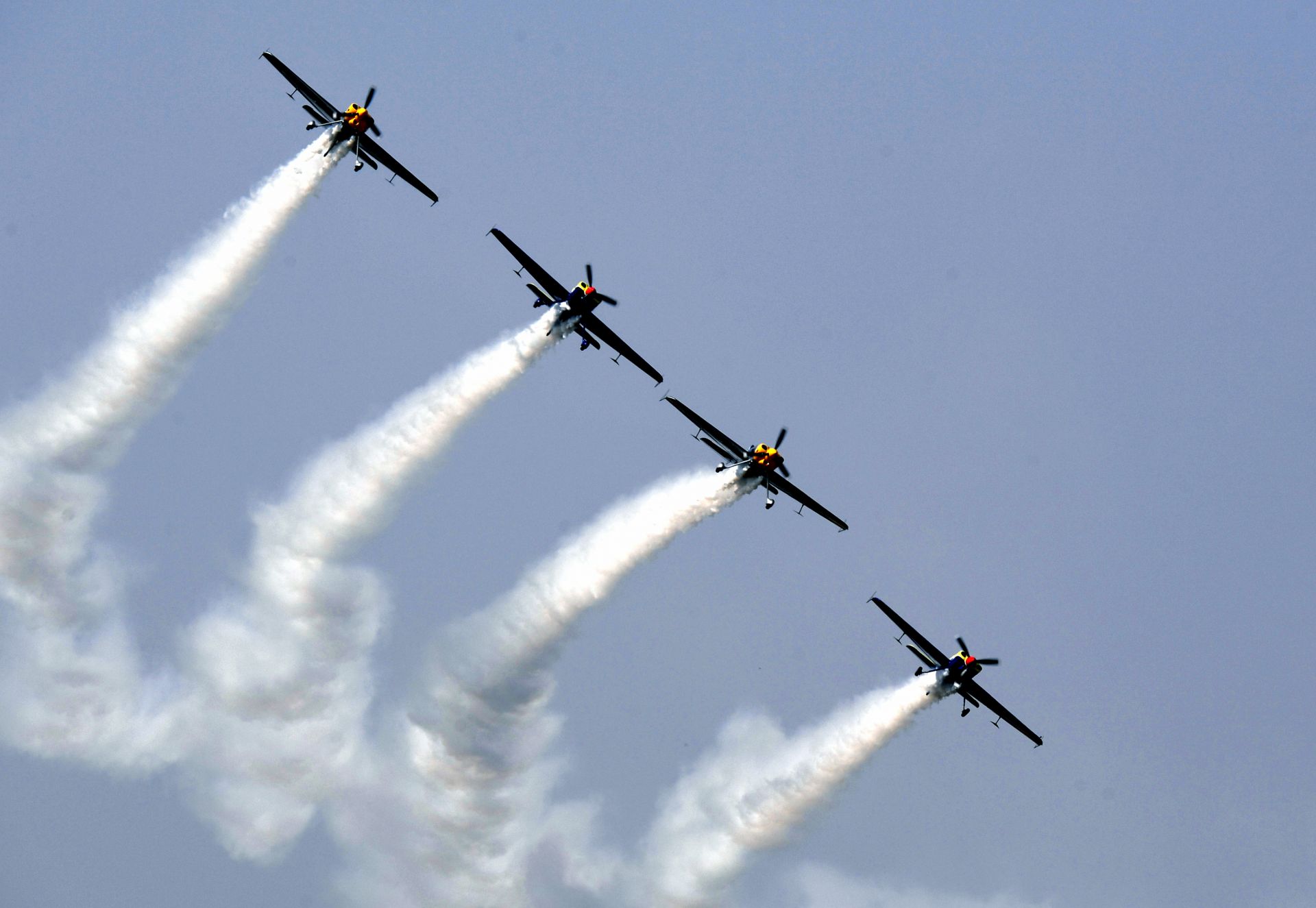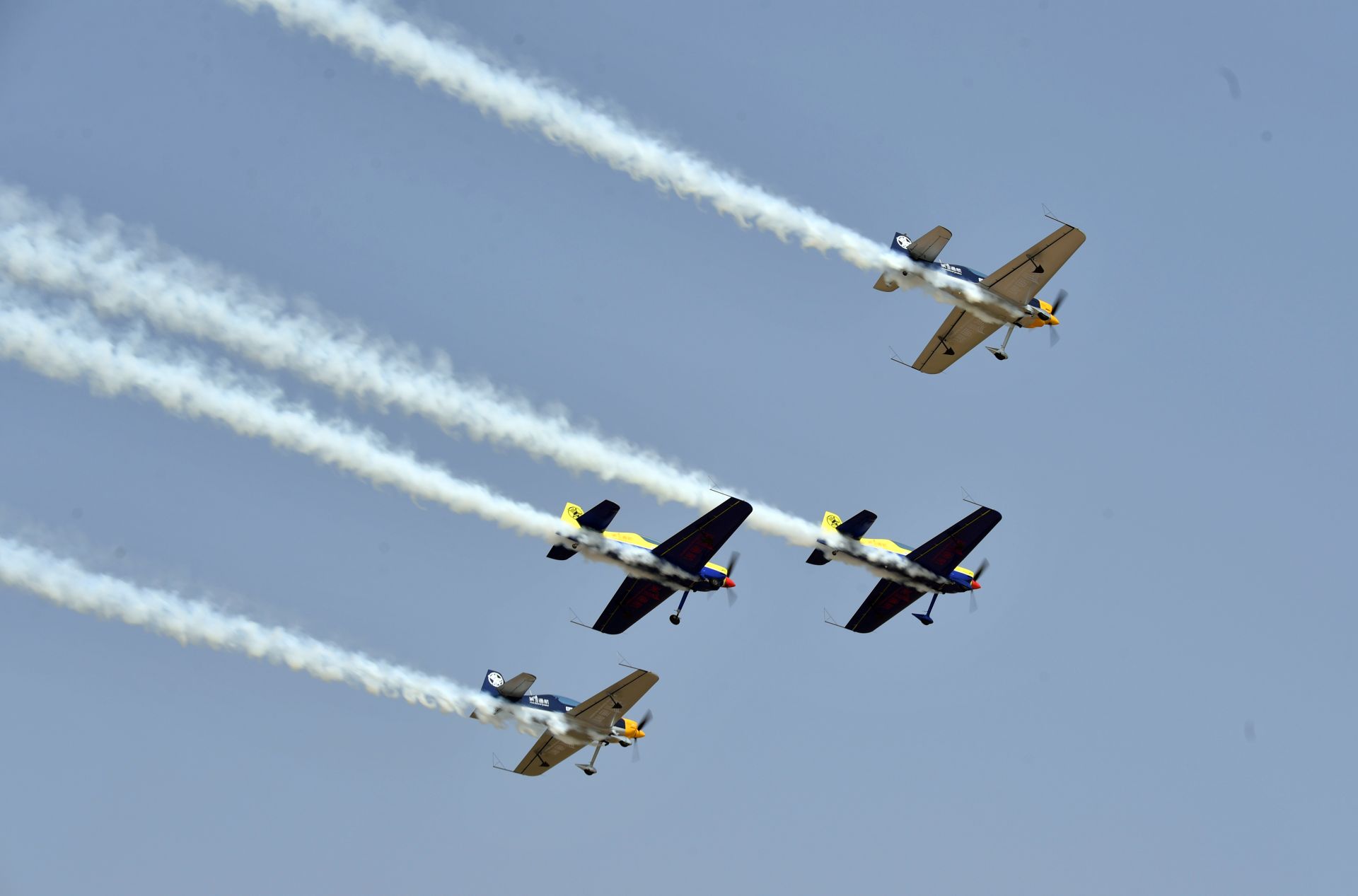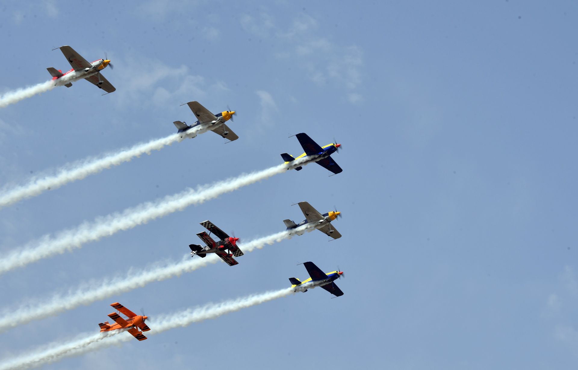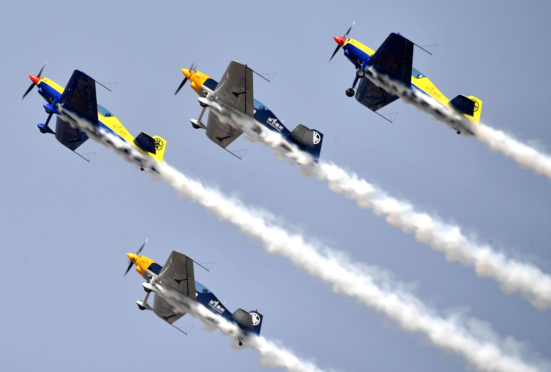 6月3日,在第十一届安阳航空运动文化旅游节开幕式上,航空运动爱好者驾驶飞机进行竞速表演。 当日,第十一届安阳航空运动文化旅游节在河南省安阳市开幕。开幕式上,来自海内外的航空运动爱好者驾驶飞机冲上云霄,在蓝天白云间进行特技飞行表演,吸引了众多市民观看。 新华社记者 李安 摄