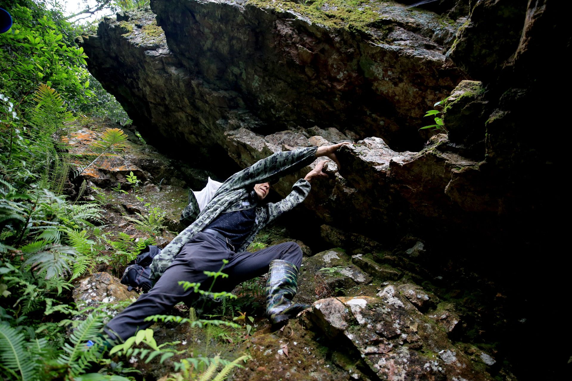6月20日,在广西柳州市融水苗族自治县汪洞乡罗洞村,村民韦锦军爬上悬崖前去采割夏至蜜。新华社发(龙涛 摄)