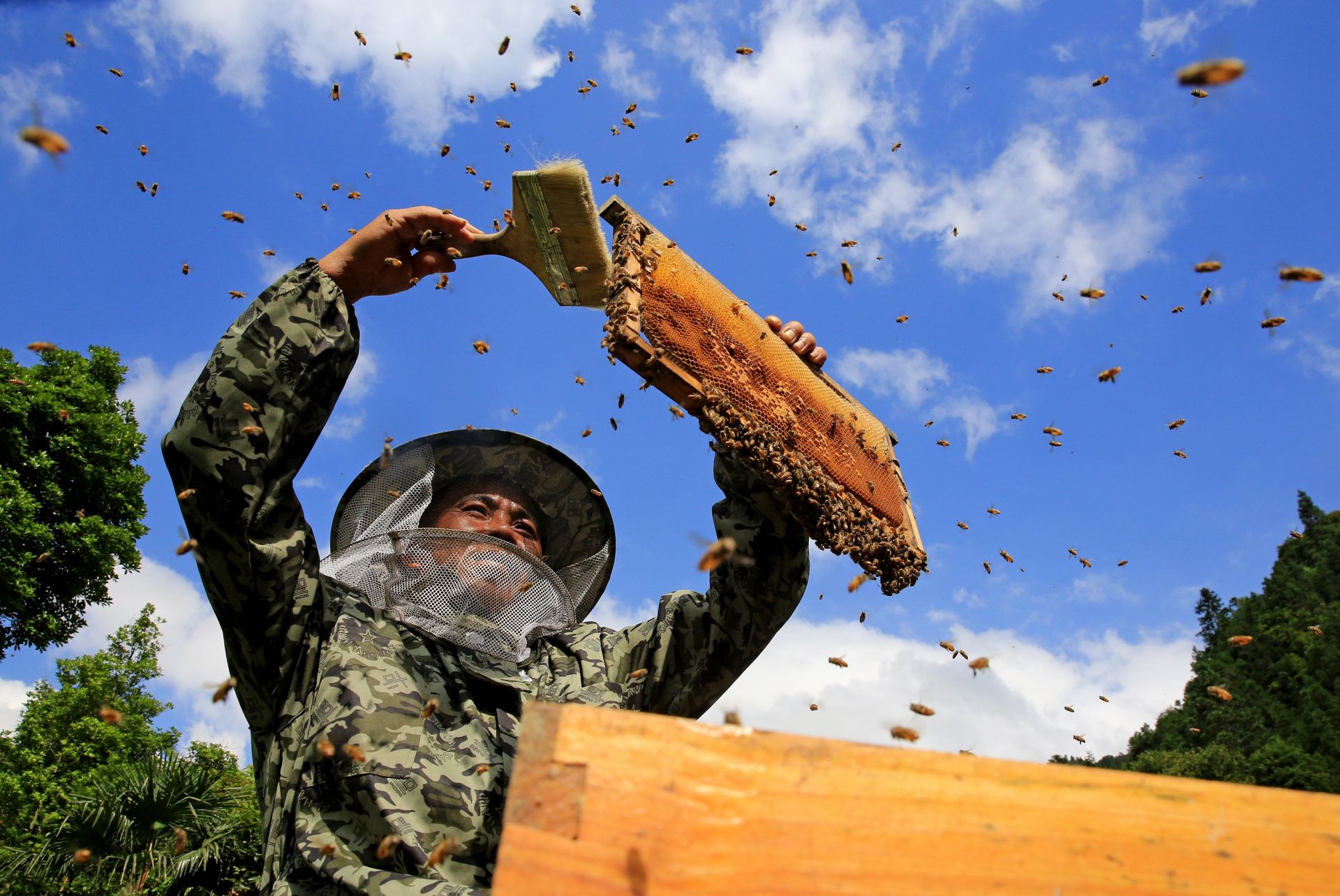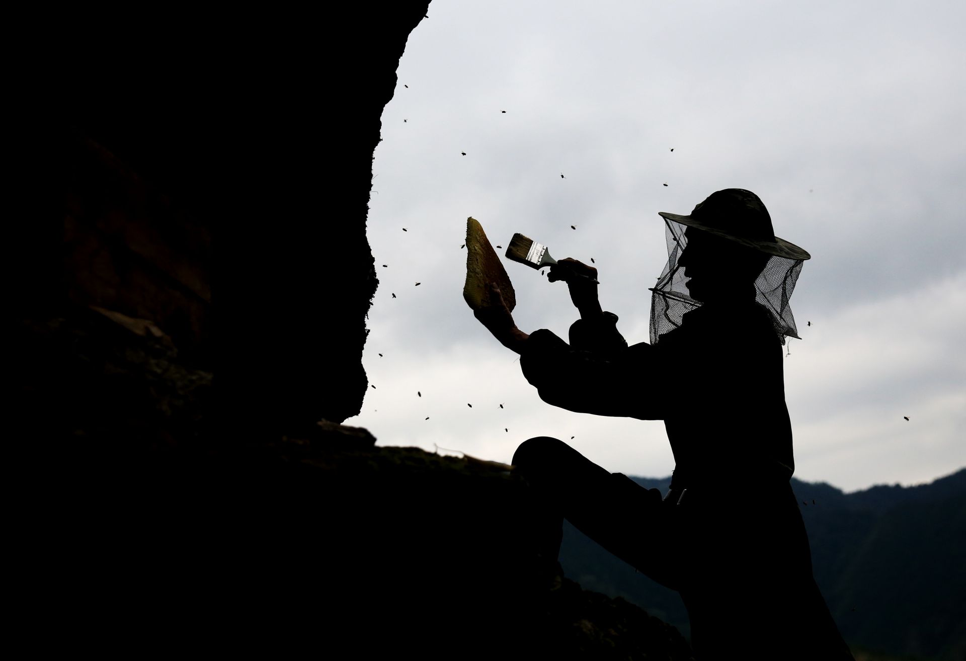 6月20日,在广西柳州市融水苗族自治县汪洞乡罗洞村,村民汪安仕在悬崖上采割夏至蜜。新华社发(龙涛 摄)