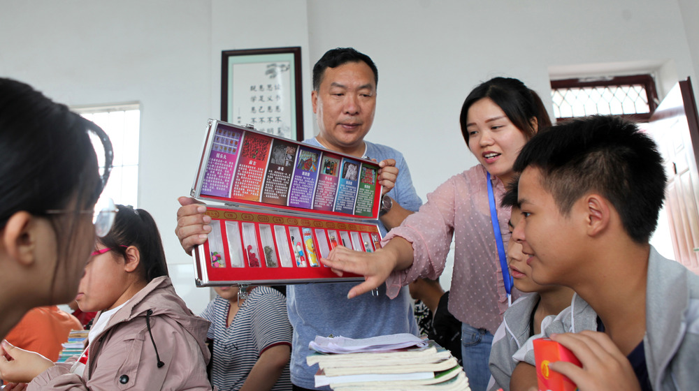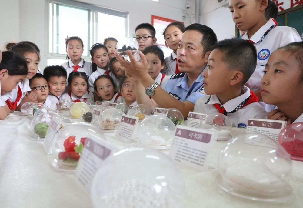 6月24日,在河北省邯郸市渚河路小学,民警通过仿真毒品样本向学生讲解毒品危害。 新华社发(杨扬摄)