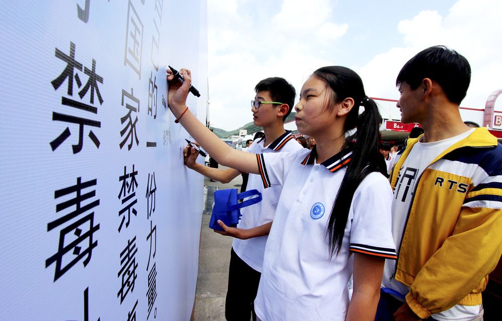 6月24日,在浙江省台州市宏光学校,学生在拒绝毒品签名墙上郑重签名。 新华社发(蒋友亲摄)