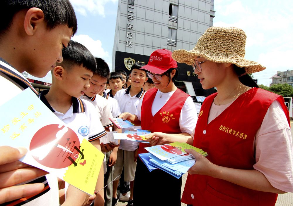 6月24日,在浙江省台州市宏光学校,志愿者向学生发放禁毒宣传资料。 在6月26日国际禁毒日前夕,各地学校开展禁毒教育,向学生讲解禁毒知识、毒品危害,增强学生识毒、防毒、拒毒的意识和能力。 新华社发(蒋友亲摄)