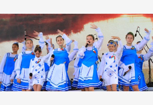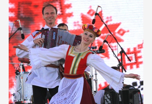 7月3日,在白俄罗斯首都明斯克,人们身穿民族服装进行歌舞表演,庆祝独立日。白俄罗斯全国各地3日举行各类节庆活动,隆重庆祝白俄罗斯独立日暨二战中从德国法西斯占领下解放75周年。新华社 发(任科夫 摄)
