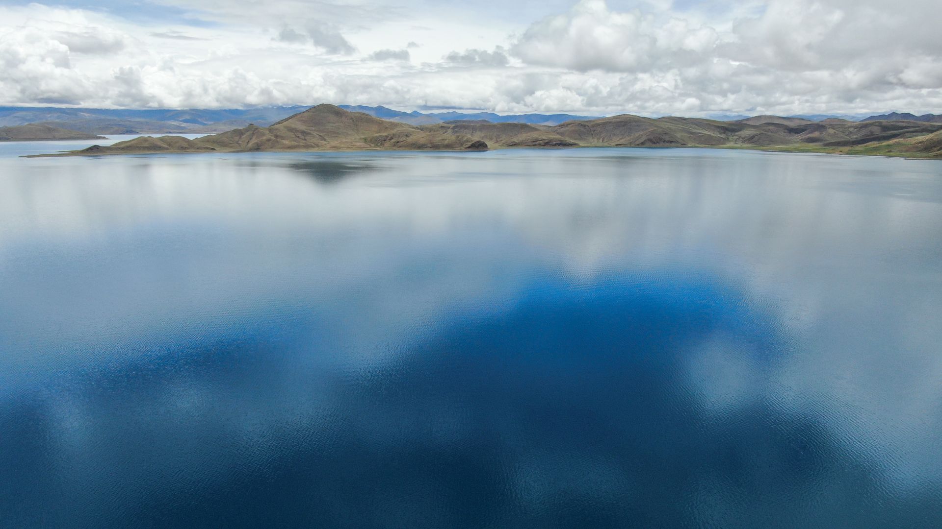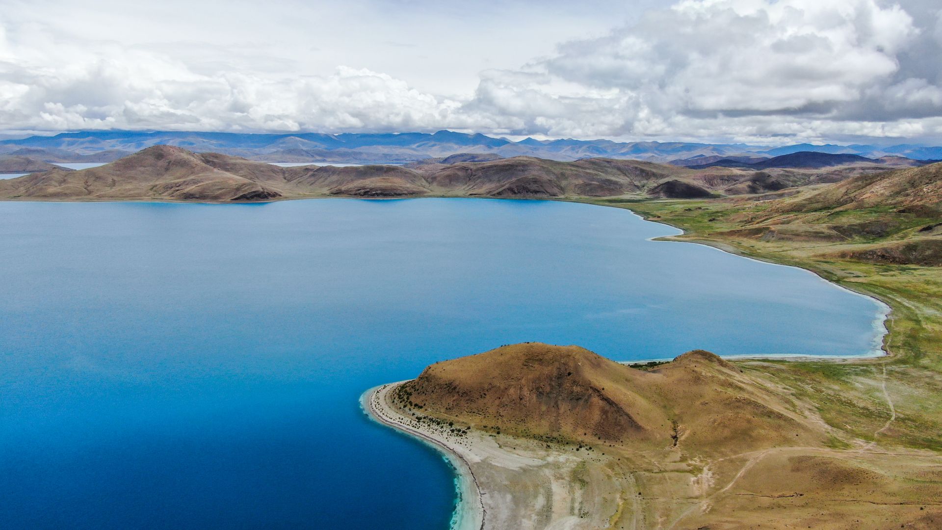 羊卓雍错的湖水,蔚蓝如玉(7月22日无人机拍摄)。新华社记者 晋美多吉 摄