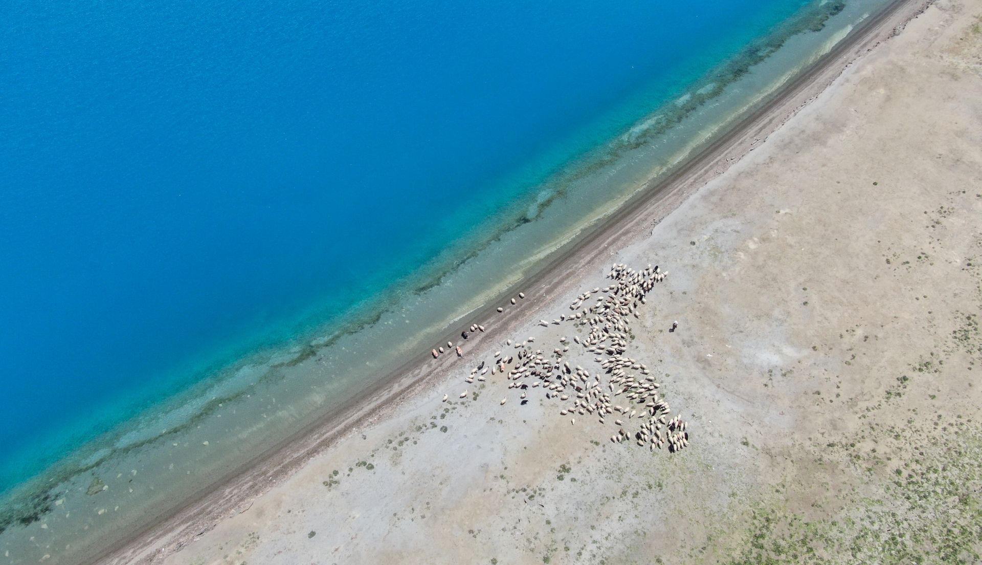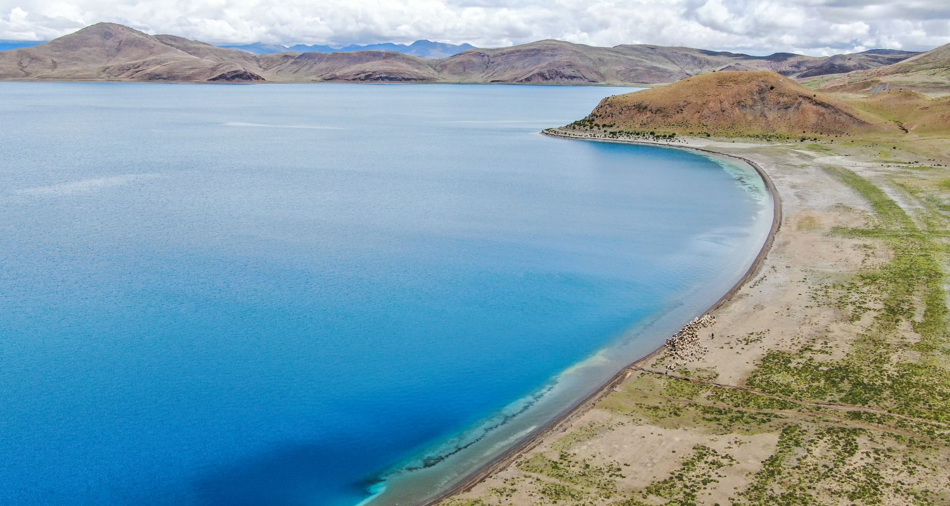 一群羊来到羊湖边喝水(7月22日无人机拍摄)。 羊卓雍错简称羊湖,位于西藏山南市浪卡子县境内。7月,西藏进入雨季,羊卓雍错降雨丰富,自然景色壮丽奇美。 新华社记者 晋美多吉 摄