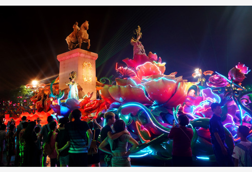 8月8日,游客在西安曲江大唐不夜城内观看花车巡游。近年来,西安以发展“夜经济”为突破口,拉长城市旅游产业链,通过打造特色夜游街区、实施夜景亮化提升工程、开展多主题夜间文化演艺活动、鼓励商户延长营业时间等方式,满足广大游客和市民的需求,使“夜游西安”成为古都旅游新亮点。新华社记者 刘潇 摄