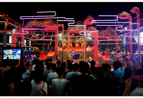 8月8日,游客在西安曲江大唐不夜城内观看音乐演出。近年来,西安以发展“夜经济”为突破口,拉长城市旅游产业链,通过打造特色夜游街区、实施夜景亮化提升工程、开展多主题夜间文化演艺活动、鼓励商户延长营业时间等方式,满足广大游客和市民的需求,使“夜游西安”成为古都旅游新亮点。 新华社记者 刘潇 摄