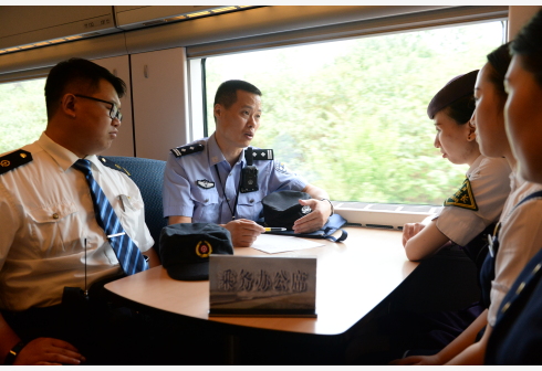 8月14日,在D3056次列车上,王宁(左二)和列车上的工作人员召开“三乘联检”工作会议。1971年出生的王宁是合肥铁路公安处乘警支队乘务二大队副大队长,他从警近20年,先后查获逃犯75名,破获各类毒品案件70余起。工作之余,王宁自学心理学课程,通过考试取得国家二级心理咨询师资格,结合实际工作,他把心理学和查堵犯罪相结合,提高工作效率。随着2019年暑运迎来客流返程期,王宁和同事投入到又一轮的忙碌之中。王宁希望值乘的每一趟列车都能平安到站,列车上的每一个旅客都能平安到家。 新华社 发(黄博涵 摄)