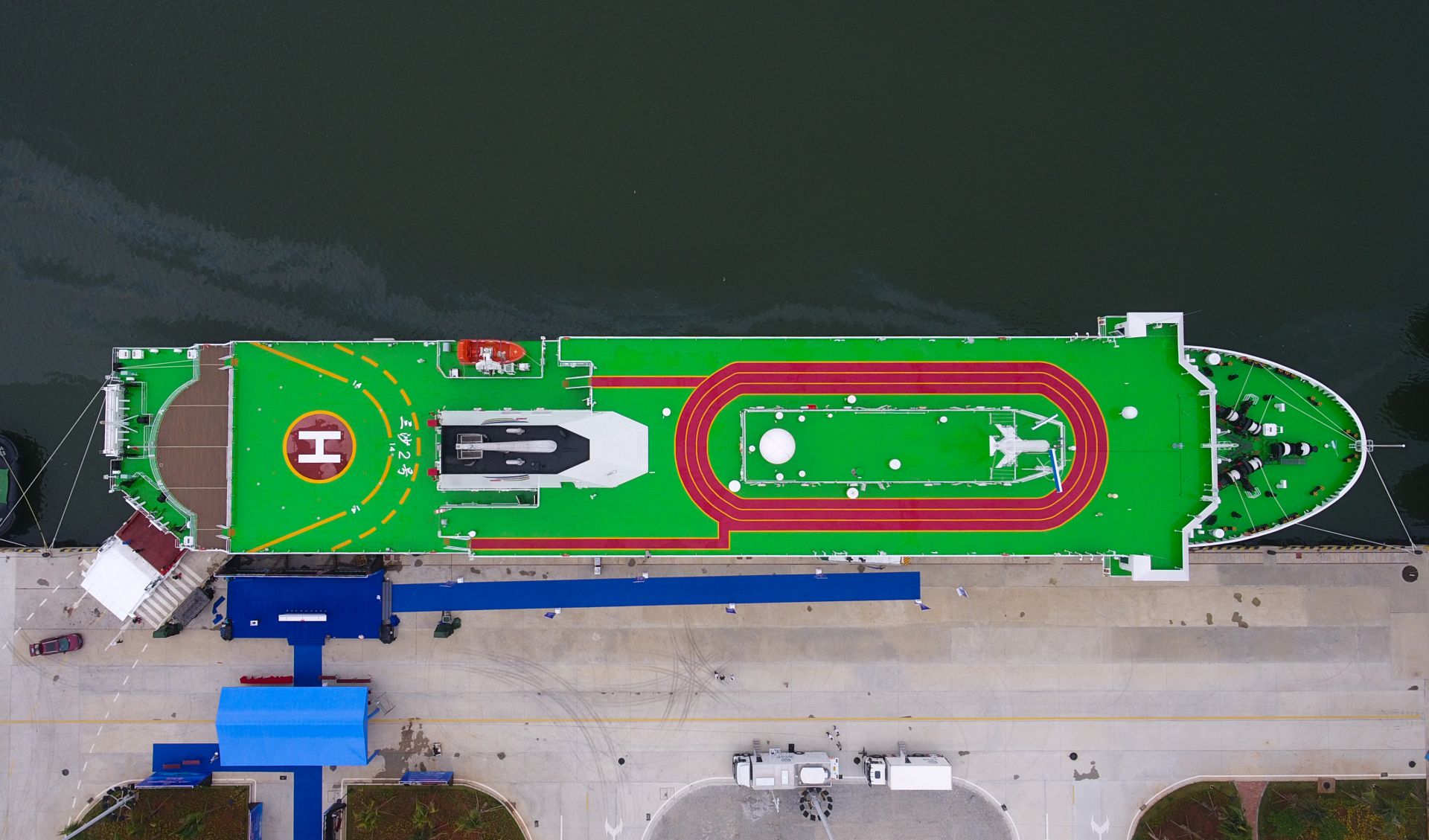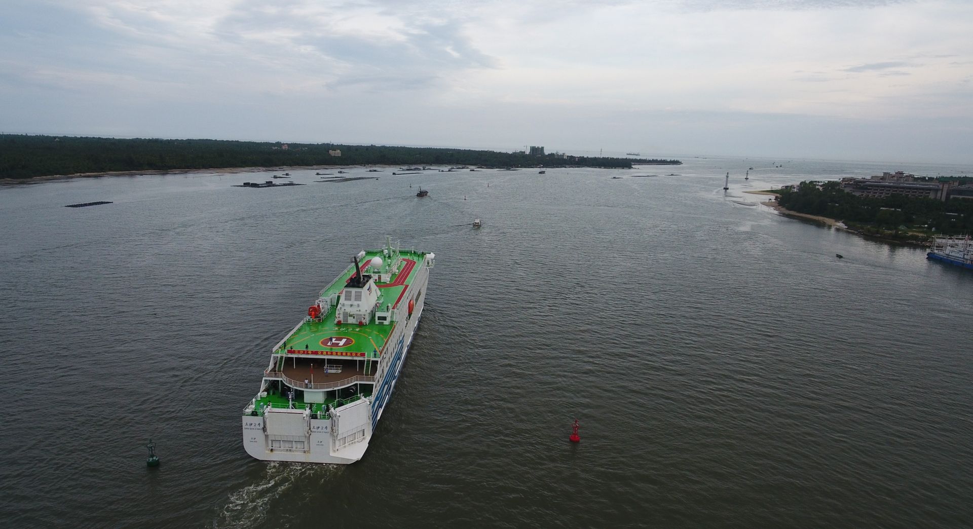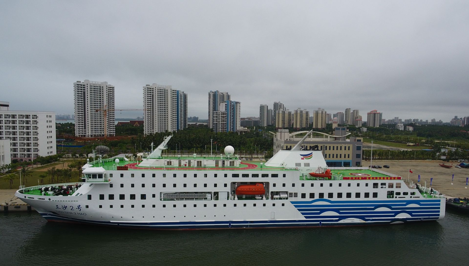 8月20日,“三沙2号”交通补给船驶离文昌市清澜港(无人机拍摄)。 当日,三沙设市后建造的第二艘交通补给船“三沙2号”在海南省文昌市清澜港举行首航仪式,随即驶往三沙永兴岛。据了解,“三沙2号”续航能力6000海里,可搭载乘客400人。 新华社记者 杨冠宇 摄
