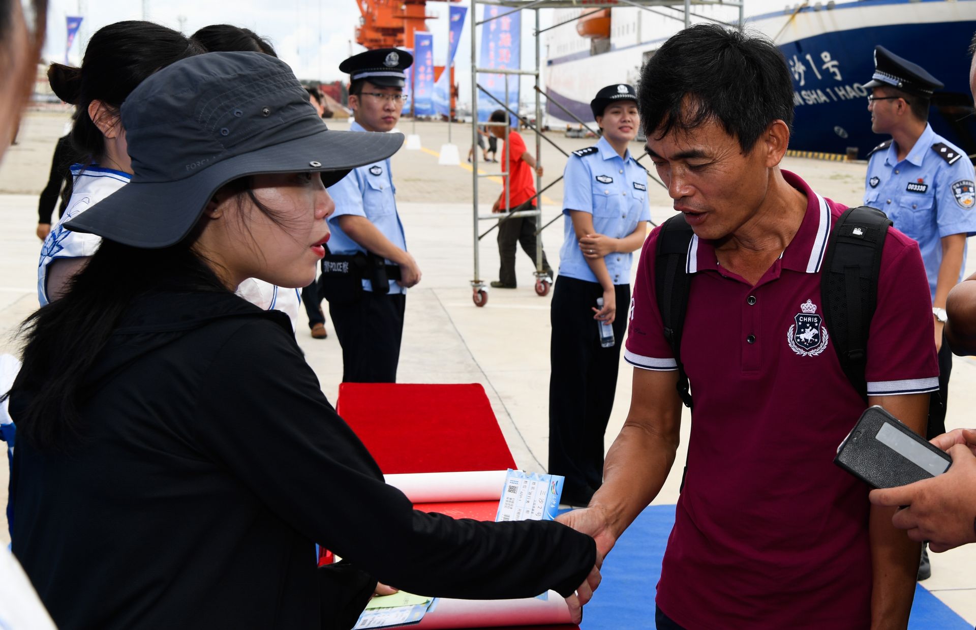 8月20日,乘客在文昌市清澜港领取“三沙2号”交通补给船首航船票。新华社记者 杨冠宇 摄
