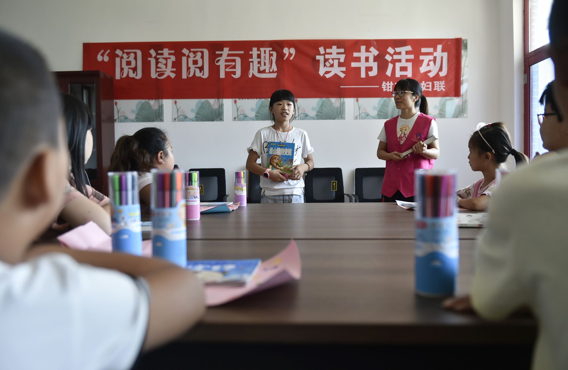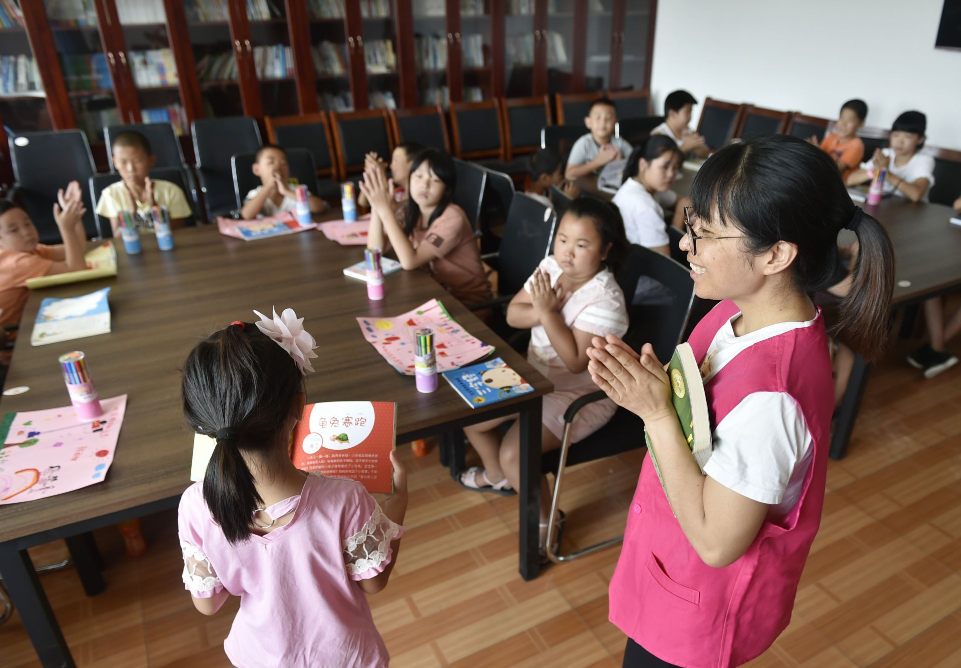 8月25日,在香河县钳屯镇红庙村图书室,一名儿童(前左)为大家阅读童话故事。新华社记者 鲁鹏 摄