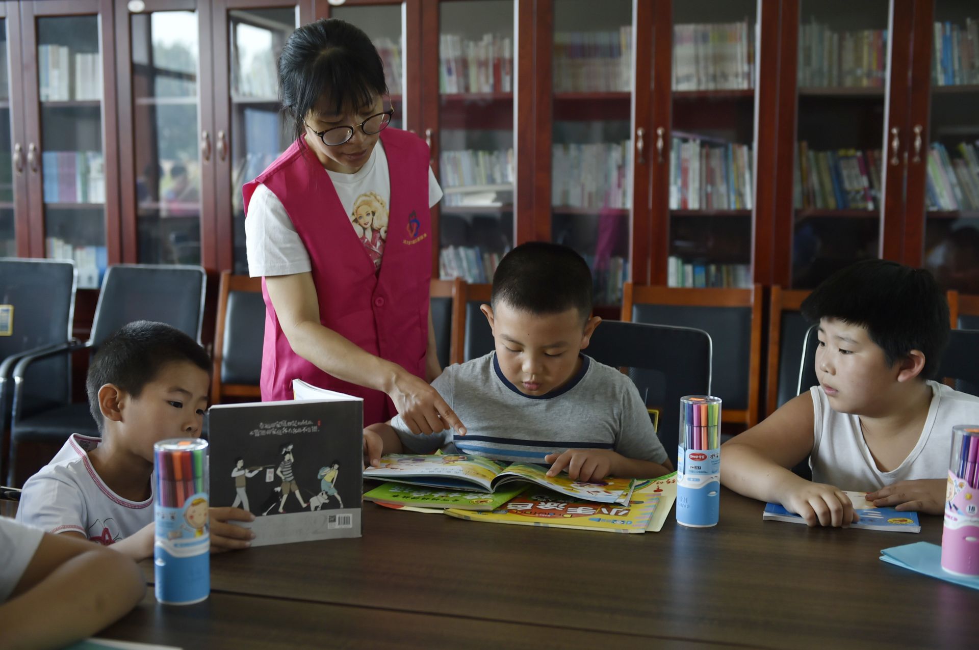 8月25日,在香河县钳屯镇红庙村图书室,指导老师(左二)在指导孩子们阅读图书。新华社记者 鲁鹏 摄