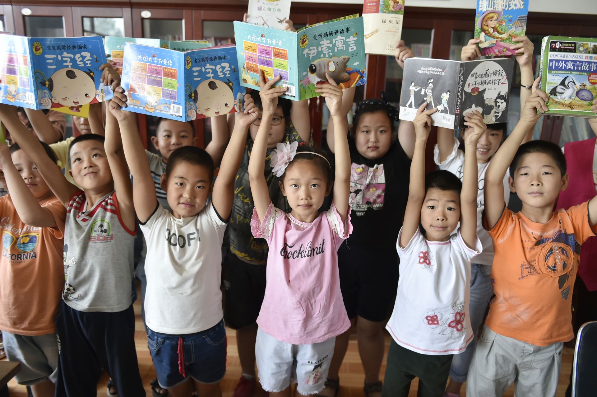 8月25日,在香河县钳屯镇红庙村图书室,孩子们展示参加读书活动获赠的图书。新华社记者 鲁鹏 摄