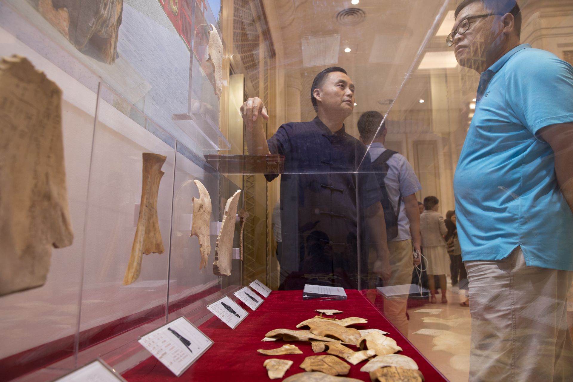 8月26日,在“开放的河南更出彩”新闻发布会现场,参观者在了解甲骨文历史。新华社记者 金立旺 摄