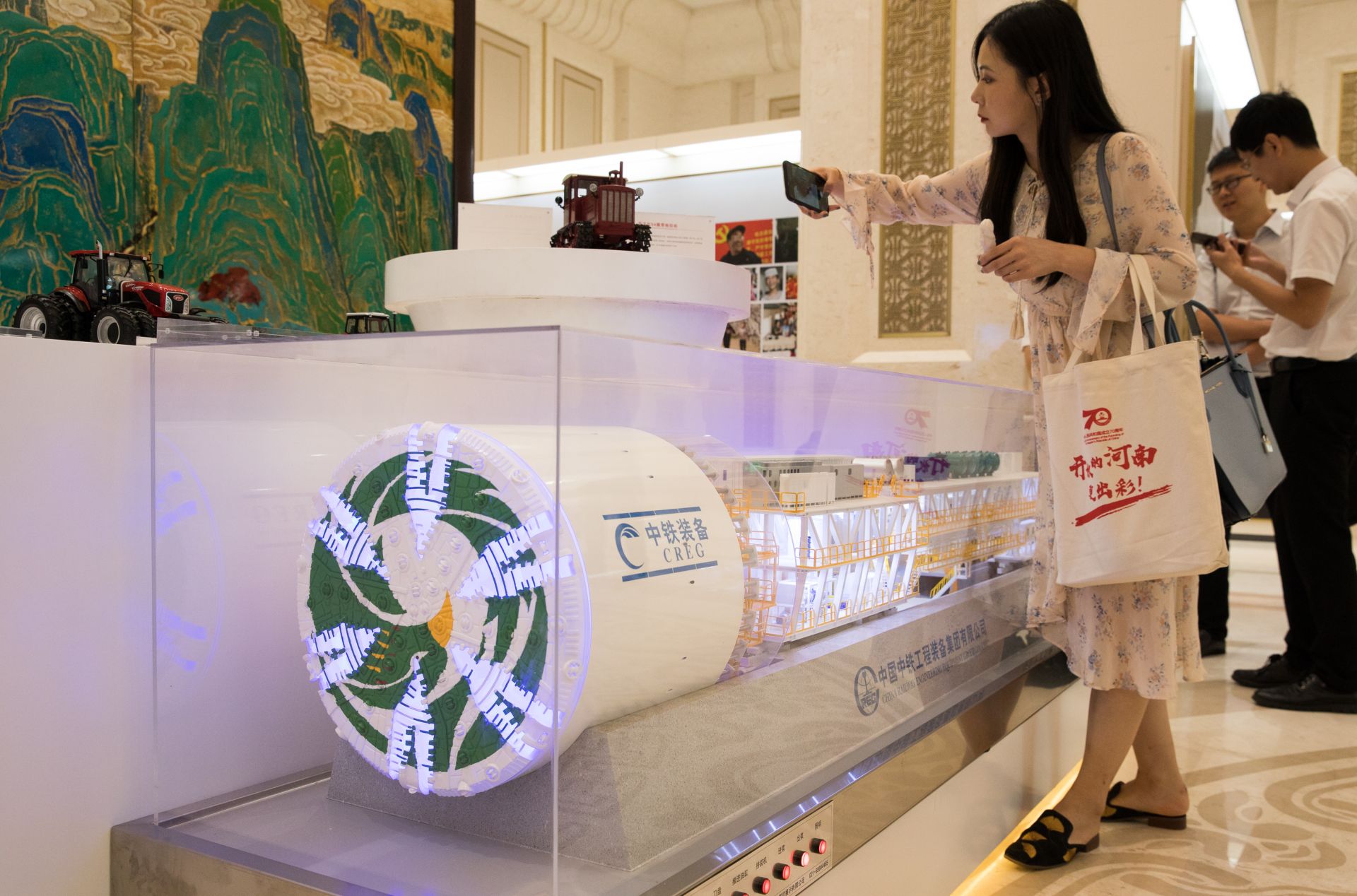 8月26日,在“开放的河南更出彩”新闻发布会现场,一位记者在用手机拍摄展示的“春风号”盾构机模型。新华社记者 金立旺 摄