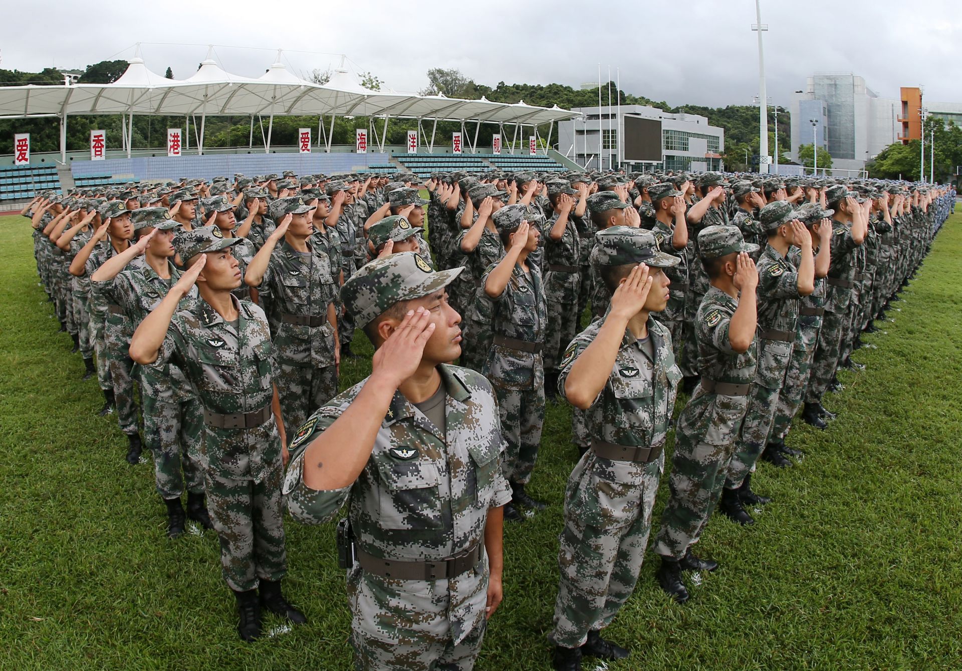 8月30日清晨,中国人民解放军驻香港部队石岗营区举行升国旗仪式。 当日,在中国人民解放军驻香港部队的座座军营,官兵整齐列阵,面对国旗庄严敬礼。这是刚刚完成第22次轮换的驻香港部队首次举行升旗仪式。 新华社发(张阳 摄)