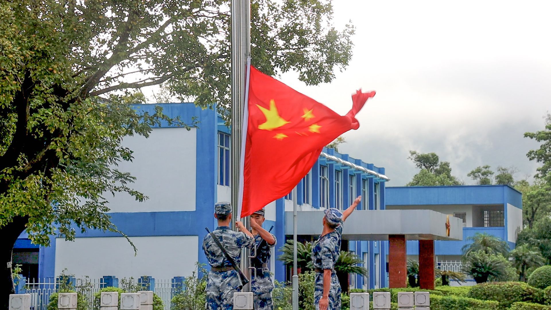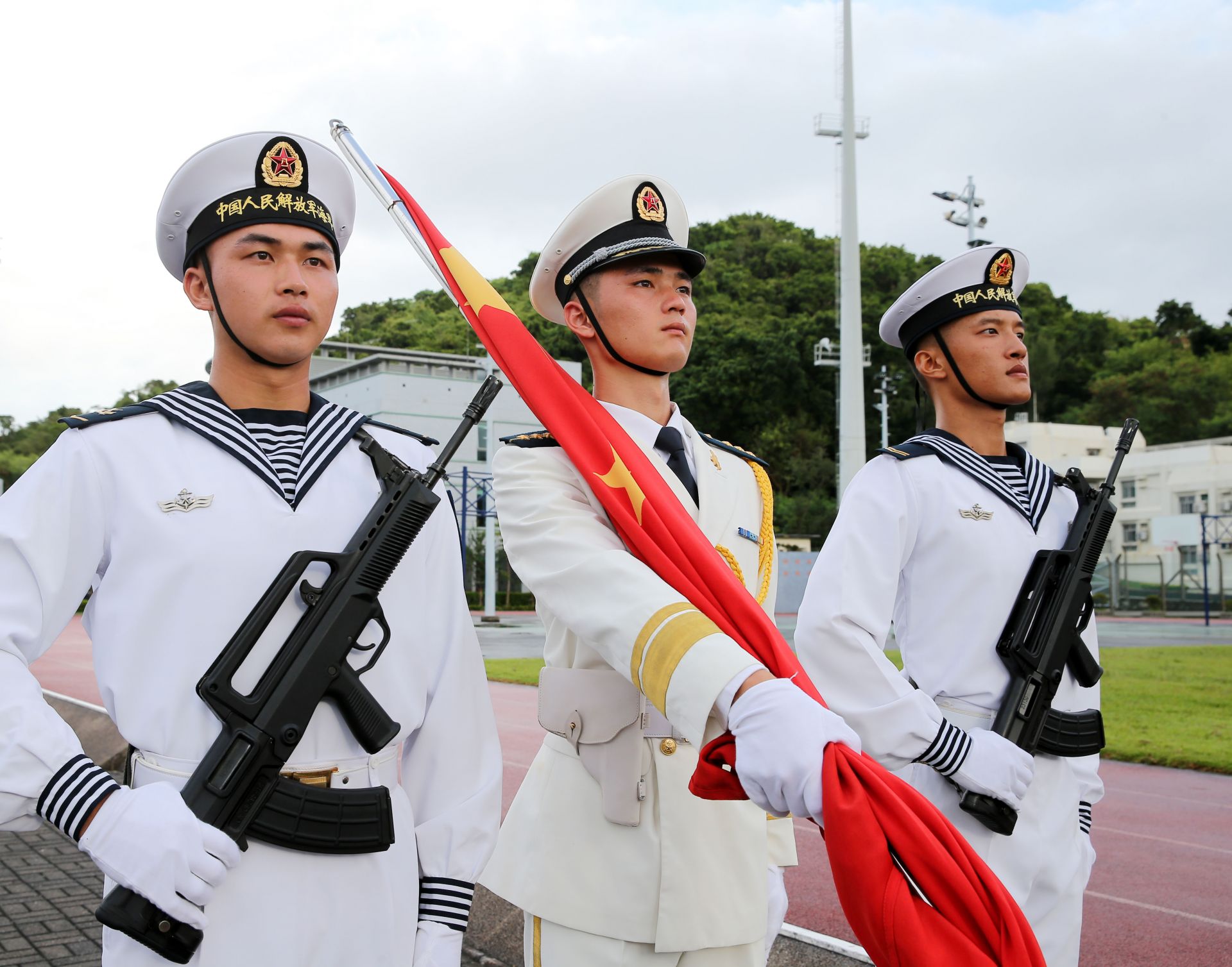 8月30日清晨,中国人民解放军驻香港部队昂船洲营区举行升国旗仪式。新华社发(易定 摄)