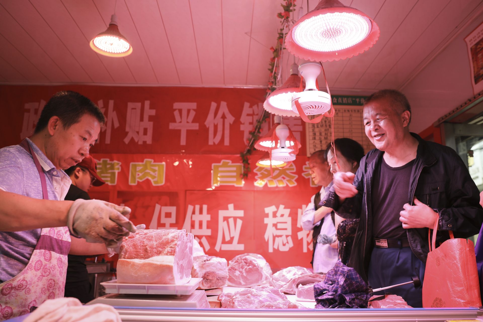 9月9日,在兰州市惠民肉食耿家庄店内,顾客在购买平价猪肉。新华社发(马希平摄)