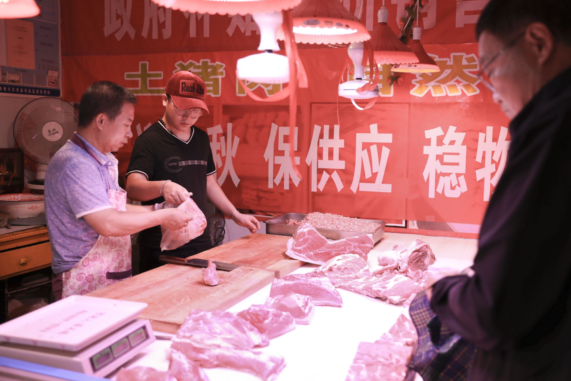 9月9日,在兰州市惠民肉食耿家庄店内,店主给猪肉称重。新华社发(马希平摄)