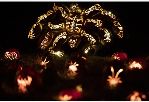 这是10月29日在美国纽约哈得孙河畔克罗顿举行的南瓜灯展上拍摄的南瓜灯。这场名为“惊悚的南瓜灯”的展览展出由工匠们雕刻的超过7000个南瓜灯,庆祝西方传统节日万圣节的到来。新华社记者 王迎 摄