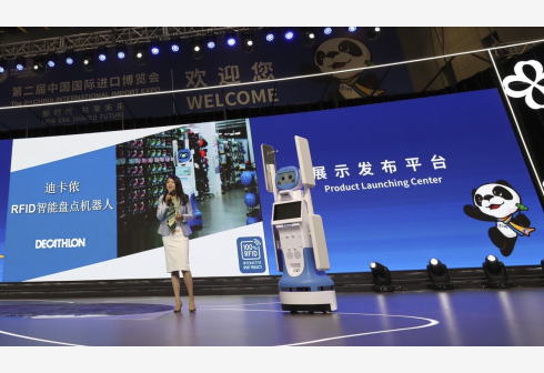 11月6日,法国迪卡侬公司的RFID智能盘点机器人“迪宝”在第二届进博会展示发布平台全球首发。正在上海举行的第二届中国国际进口博览会上,多款最新科技和产品在此实现“全球首秀”。新华社记者 金立旺 摄