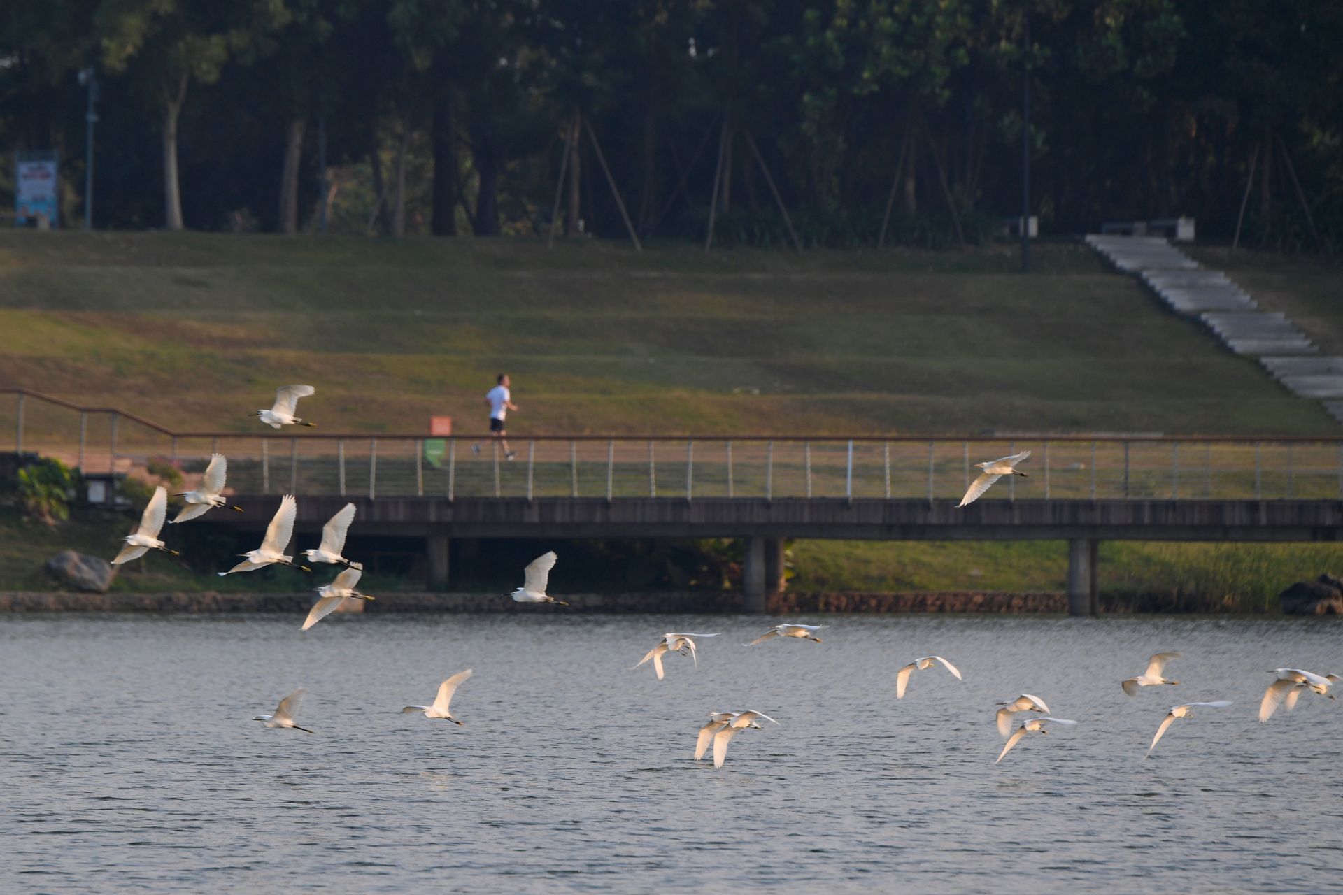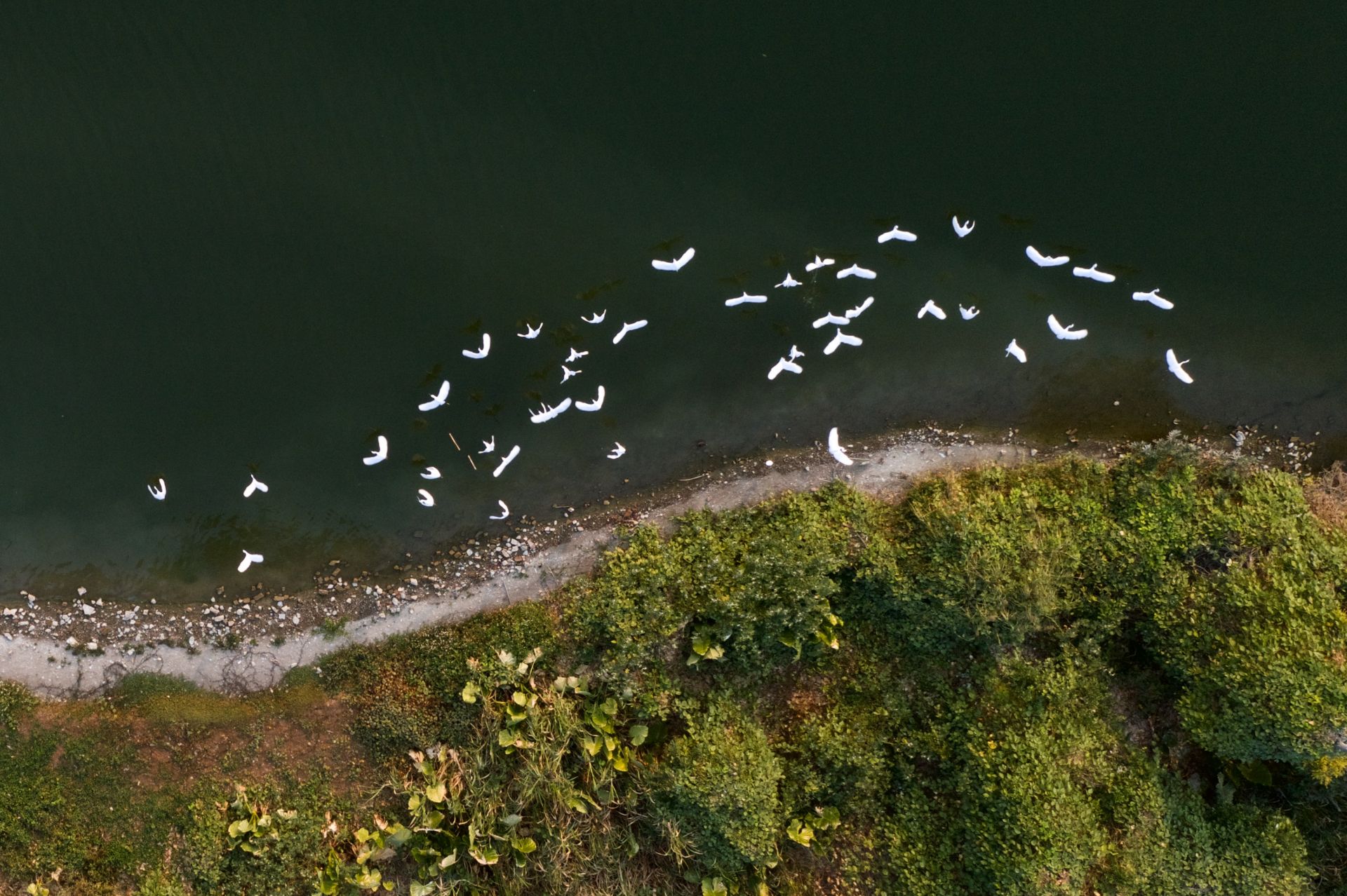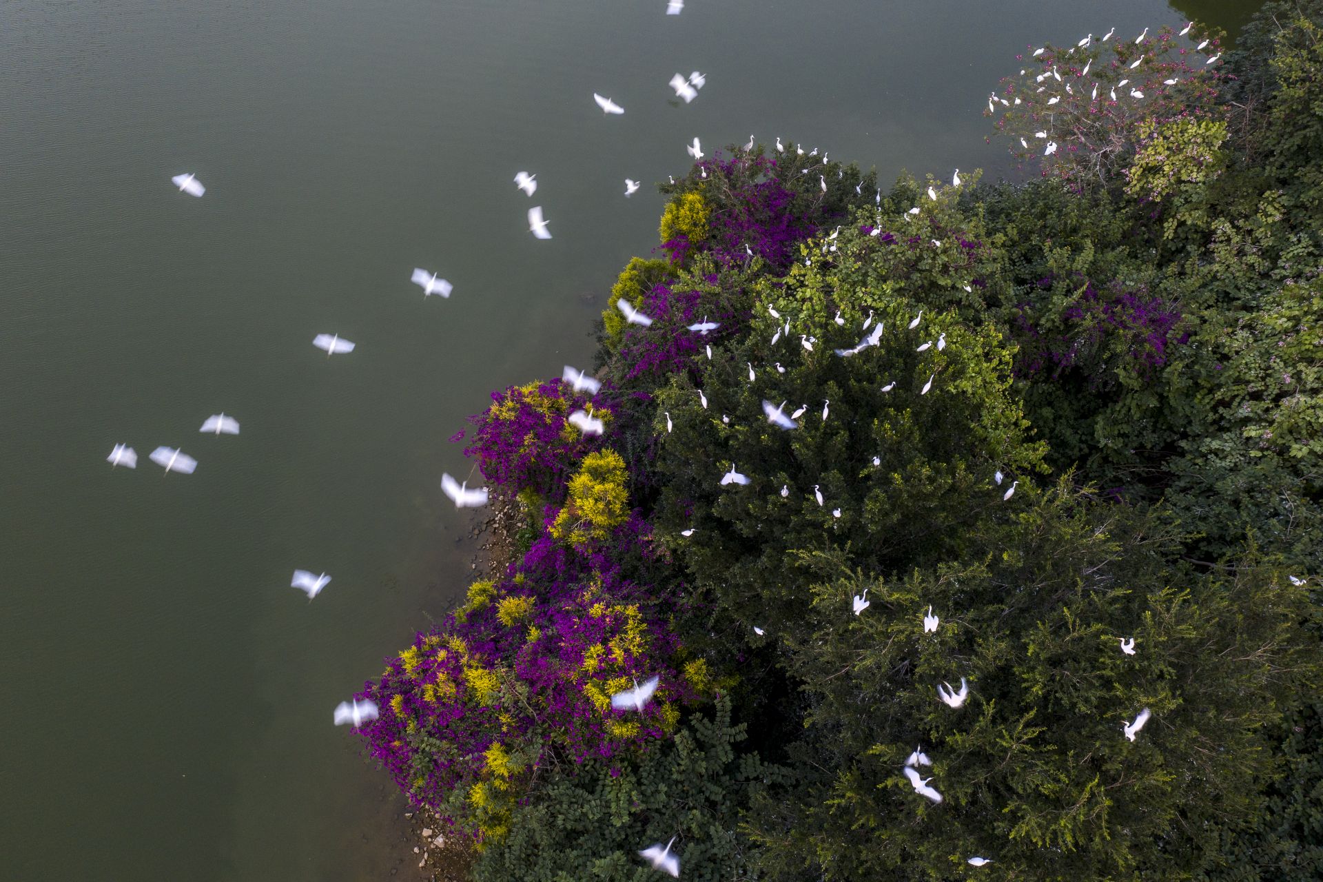 在福建省漳州市龙文区碧湖生态园,一群栖居湖心小岛的白鹭翩飞在湖面(11月13日无人机拍摄)。新华社记者 姜克红 摄