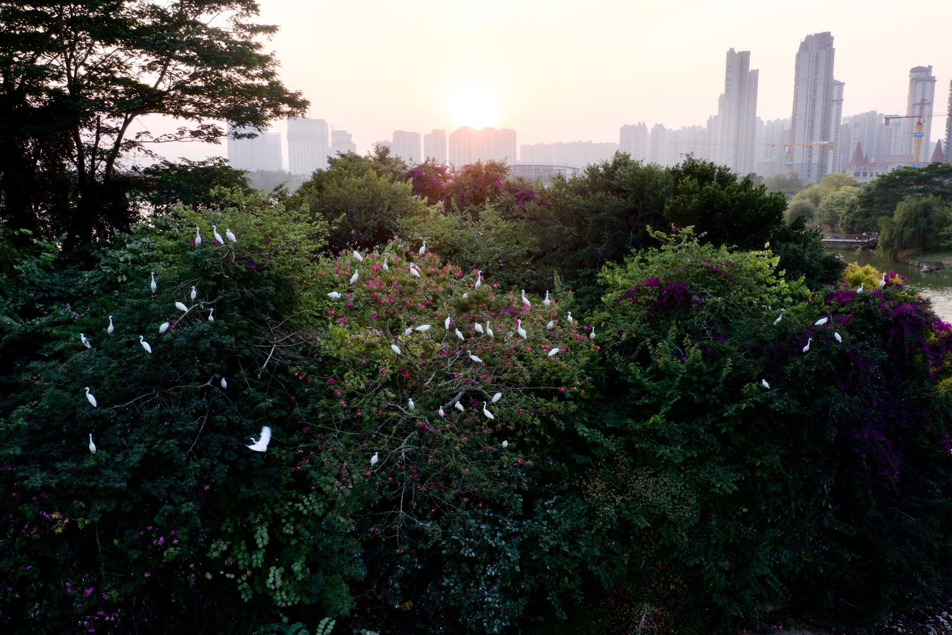 福建省漳州市龙文区碧湖生态园内一座湖心小岛成为鹭鸟栖息繁衍的家园(11月13日无人机拍摄)。 在福建省漳州市龙文区碧湖生态园内的一座心形小岛上,一群白鹭、苍鹭、夜鹭等鹭科鸟类在此安家,栖息繁衍。每当傍晚时分,一群群归家的鹭鸟翩飞在碧水荡漾的湖面,成为市民眼中一道独特的风景。 新华社记者 姜克红 摄
