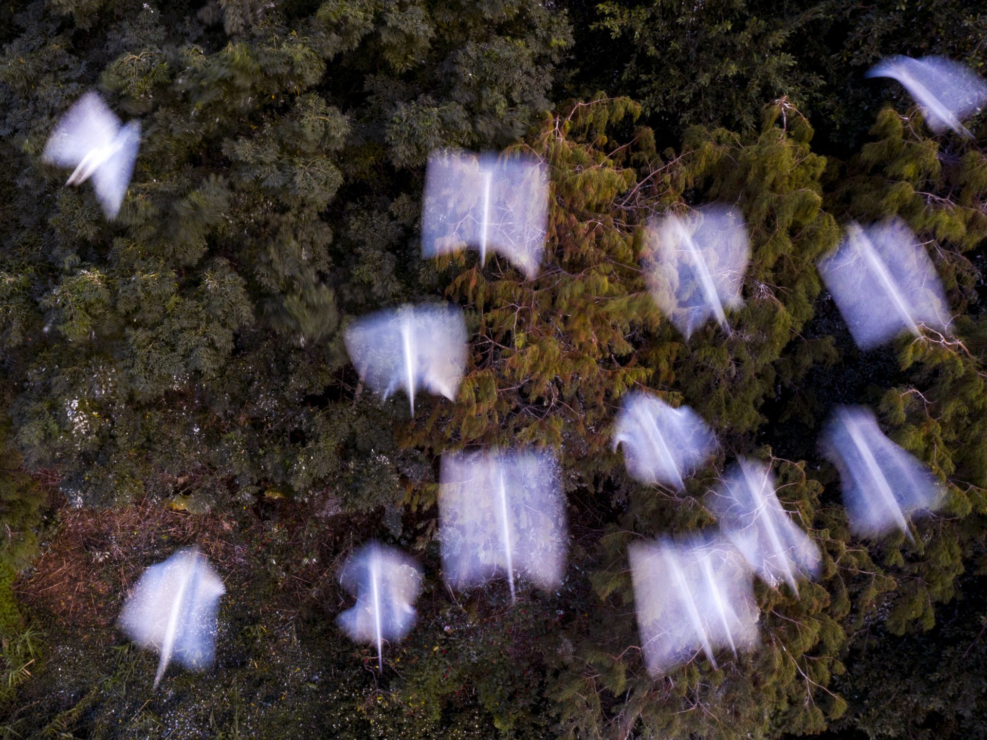 福建省漳州市龙文区碧湖生态园内的一座湖心小岛上,一群栖居于此的白鹭飞离枝头(11月13日无人机拍摄)。新华社记者 姜克红 摄