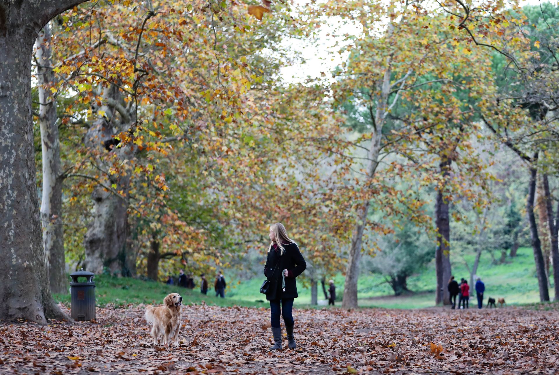 11月26日,在意大利罗马博尔盖塞公园,一名女子带着宠物狗散步。新华社记者 程婷婷 摄