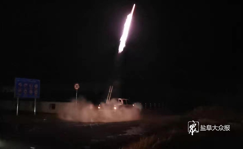 “三、二、一,发射!”,随着一声令响,四枚火箭弹相继射出,冲入云霄,伴随着震耳的轰鸣声,在漆黑的夜幕下划过一道道明亮的光束。为改善大气环境、缓解旱情,助力打造盐城生态蓝,11月30日夜间,盐城市气象局联合滨海县气象局抓住有利时机地点,在滨海县通榆河处成功实施了人工增雨作业。图为滨海县通榆河人工增雨作业现场。盐阜大众报报业集团全媒体记者 唐承兵 摄 通讯员 王红梅