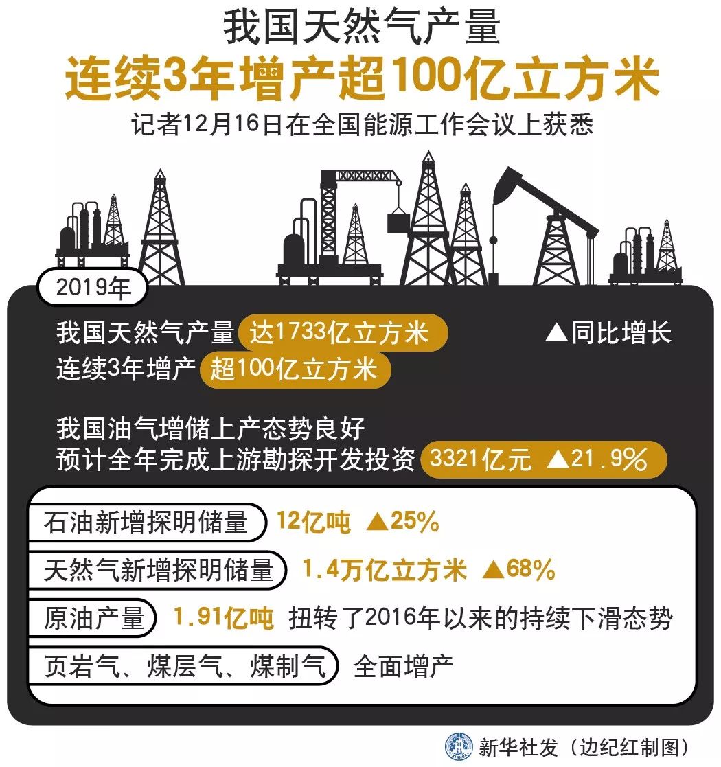 ◎2019年,我国天然气产量达1733亿立方米,连续3年增产超100亿立方米。
