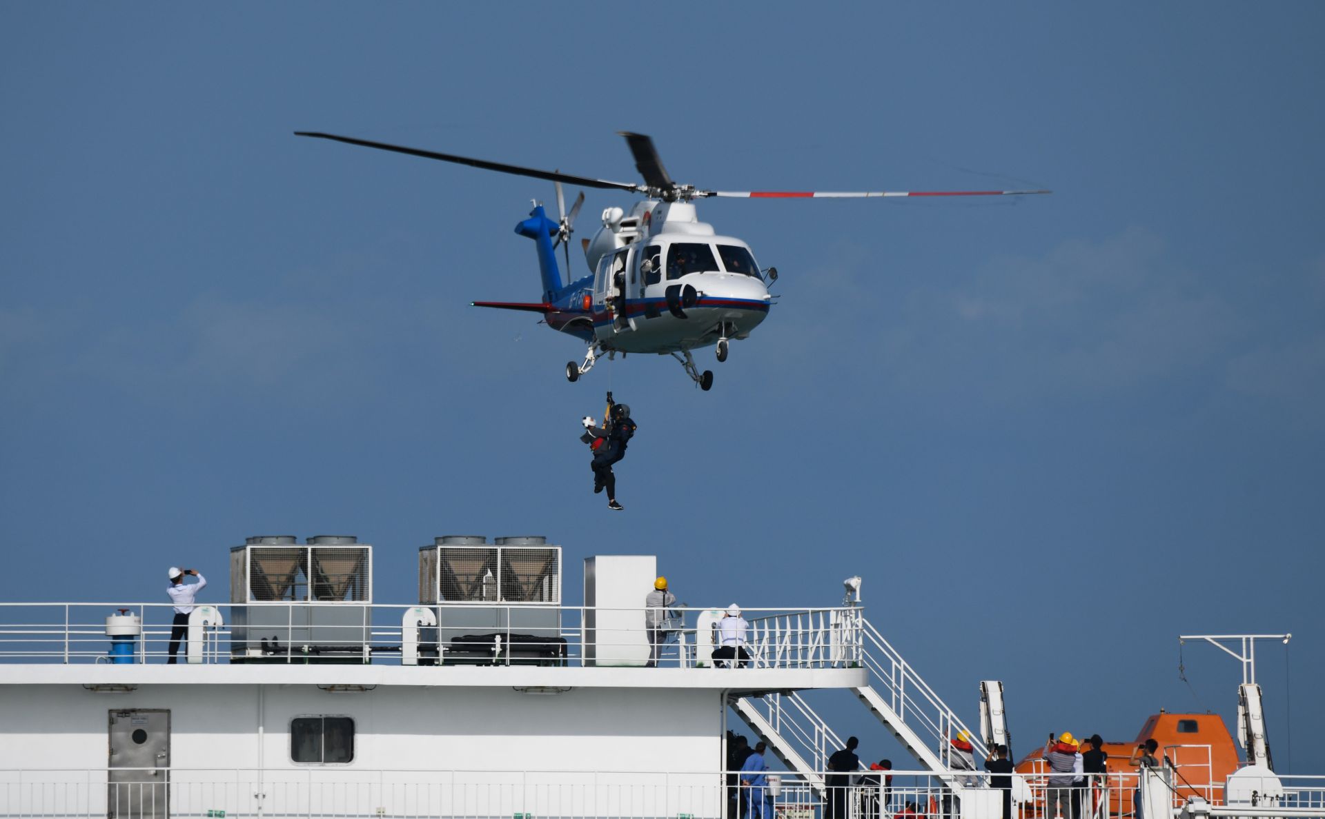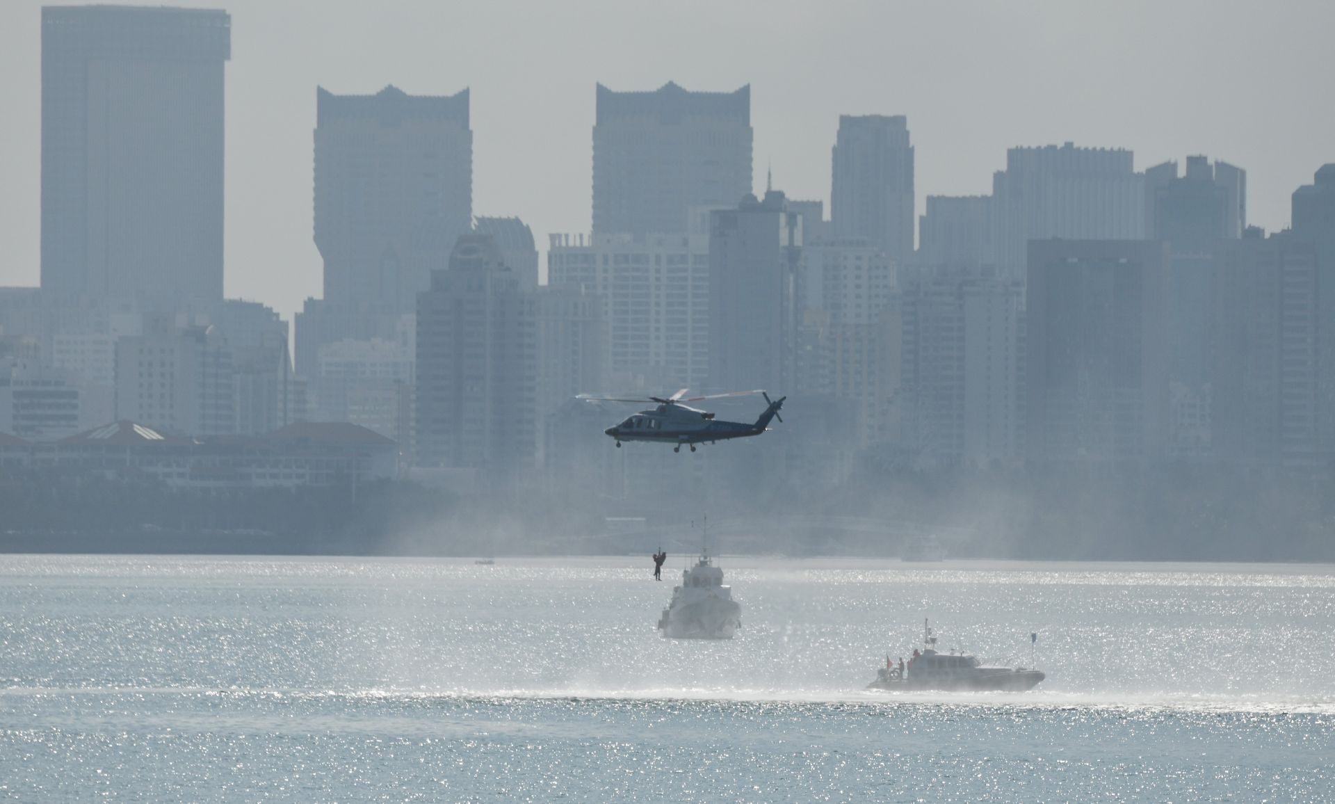 12月24日,在演练现场,南海救助局救助直升机救助落水人员。新华社记者 杨冠宇 摄