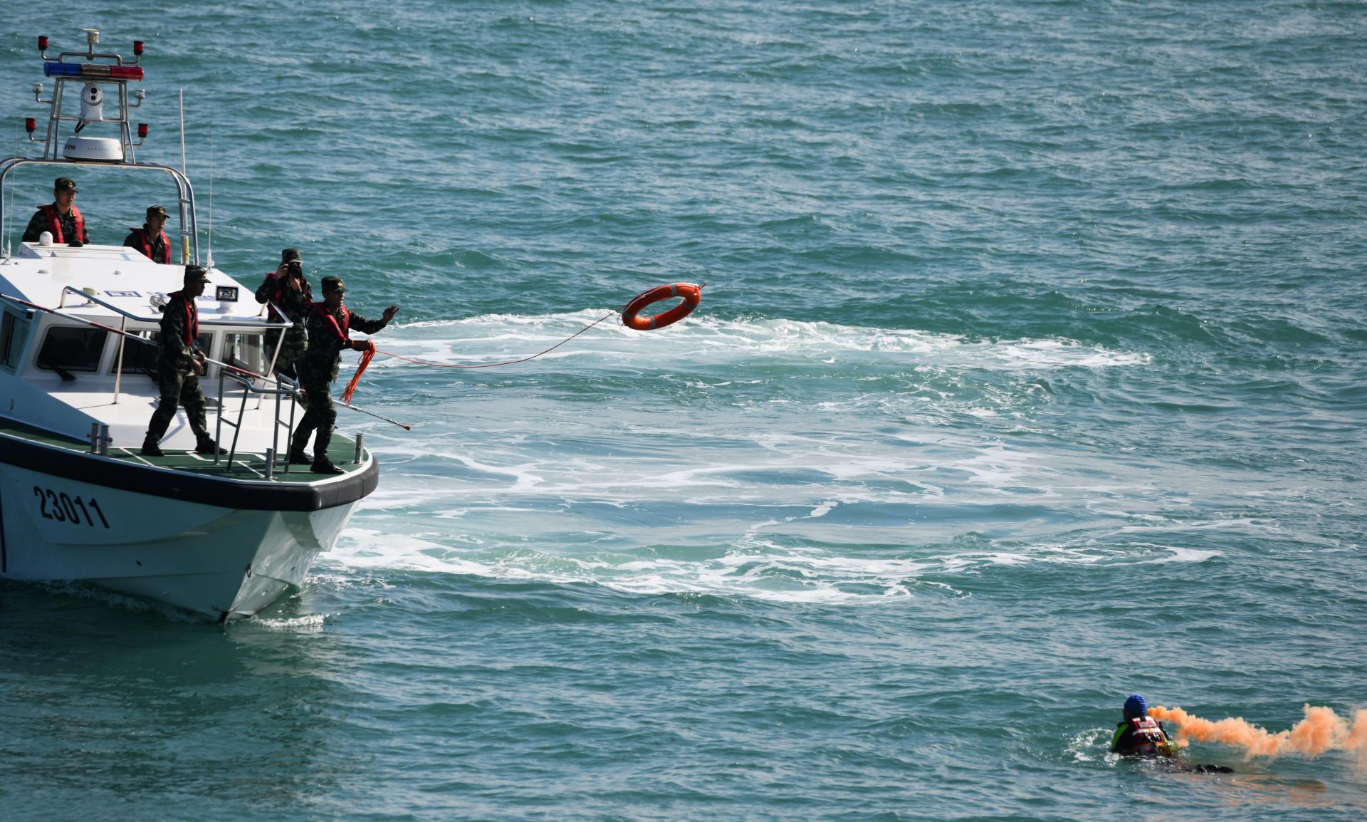 12月24日,在演练现场,搜救人员投放救生圈救助落水人员。新华社记者 杨冠宇 摄