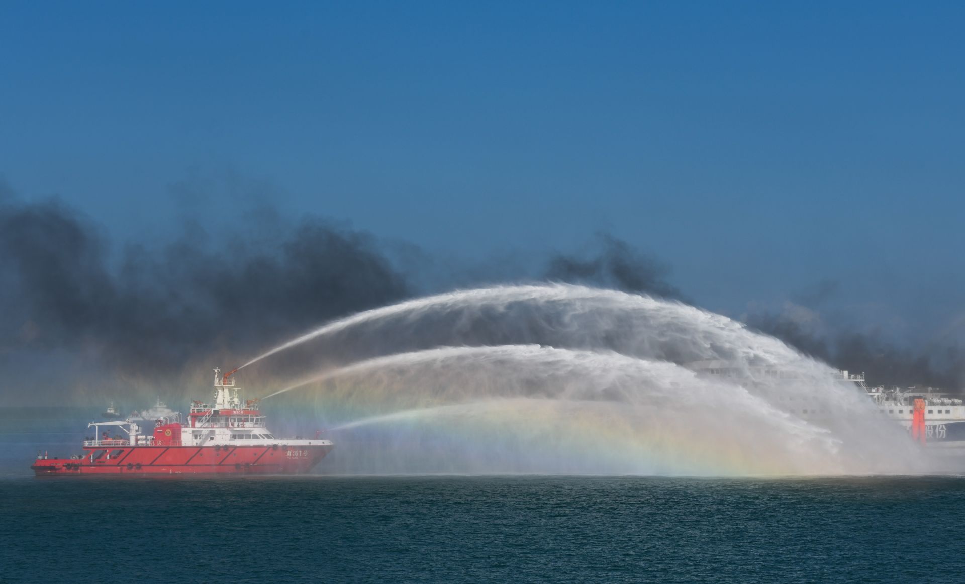 12月24日,在演练现场,“浦消1号”开展灭火作业。新华社记者 杨冠宇 摄