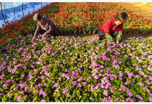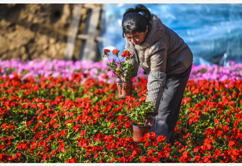 1月8日,在河北省廊坊市广阳区北旺乡花卉种植基地,花农在整理花卉。春节将至,河北省廊坊市广阳区发挥区域优势,瞄准京津花卉市场,发展特色花卉种植产业,助力农民增收。目前,培育出的天竺葵、南非万寿菊等热销鲜花品种,陆续销往京津市场。 新华社记者 李晓果 摄