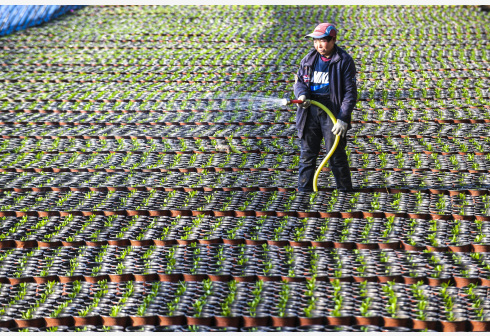 1月8日,在河北省廊坊市广阳区北旺乡花卉种植基地,花农为花苗浇水。春节将至,河北省廊坊市广阳区发挥区域优势,瞄准京津花卉市场,发展特色花卉种植产业,助力农民增收。目前,培育出的天竺葵、南非万寿菊等热销鲜花品种,陆续销往京津市场。 新华社记者 李晓果 摄