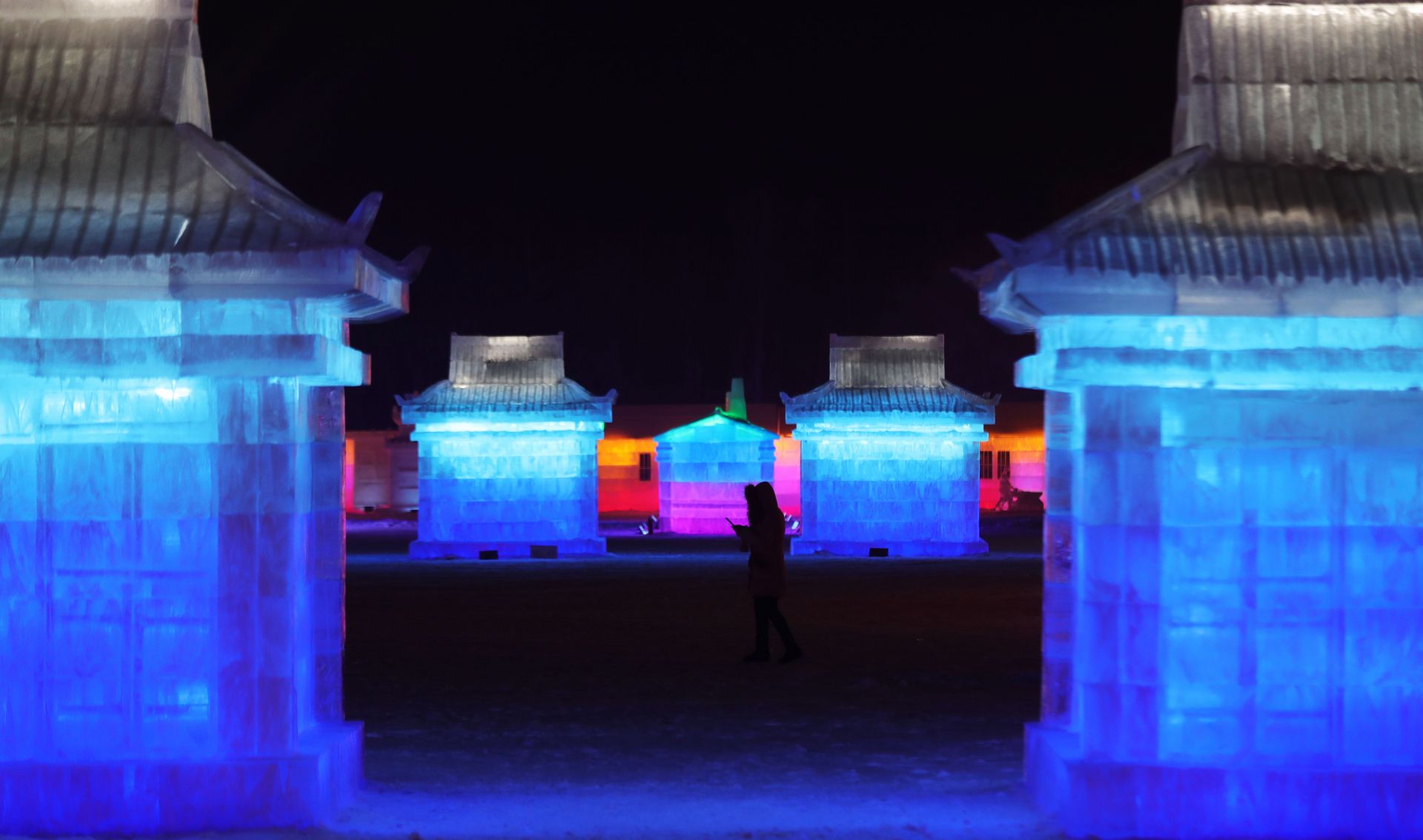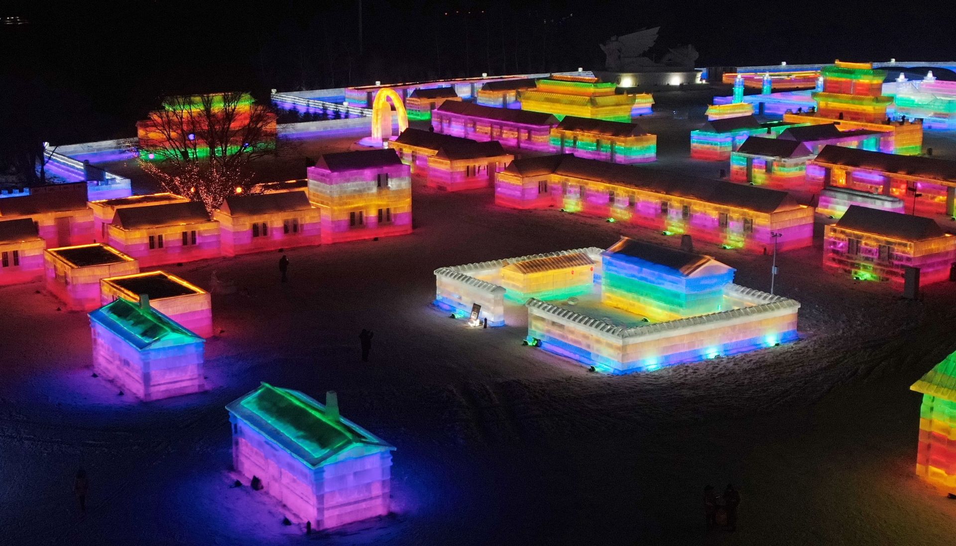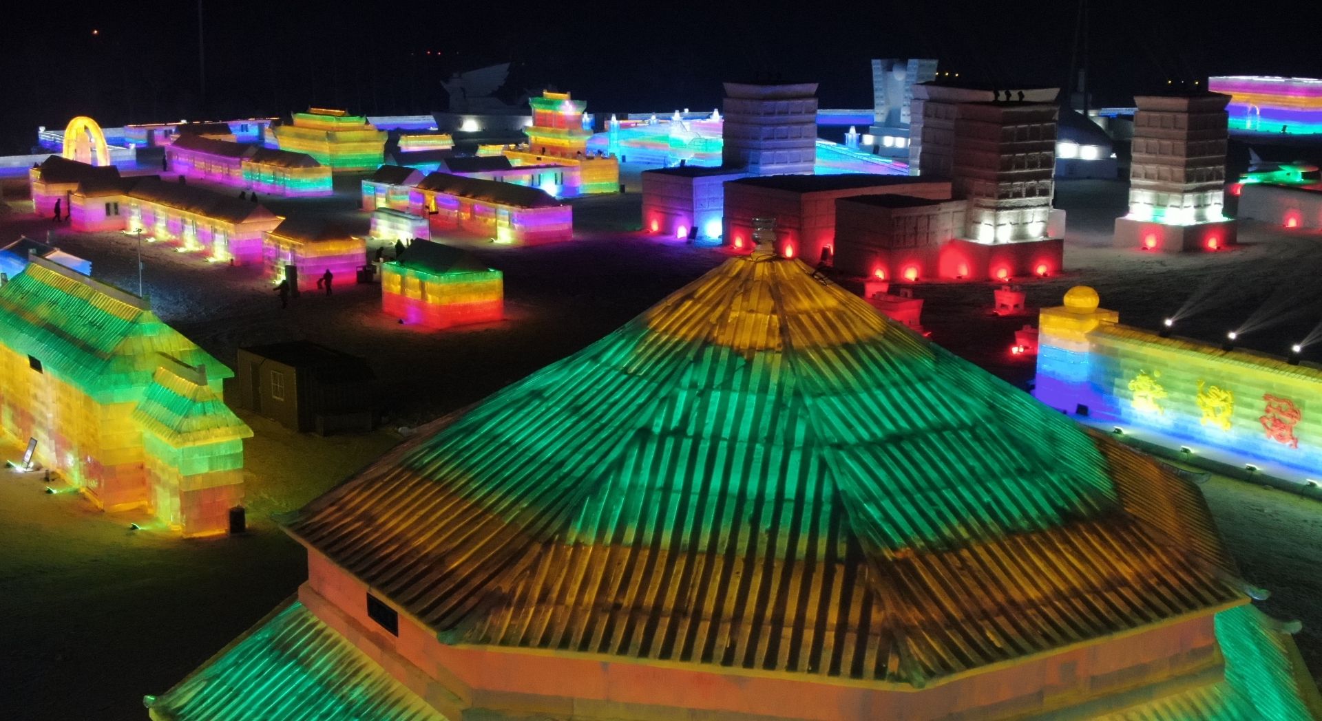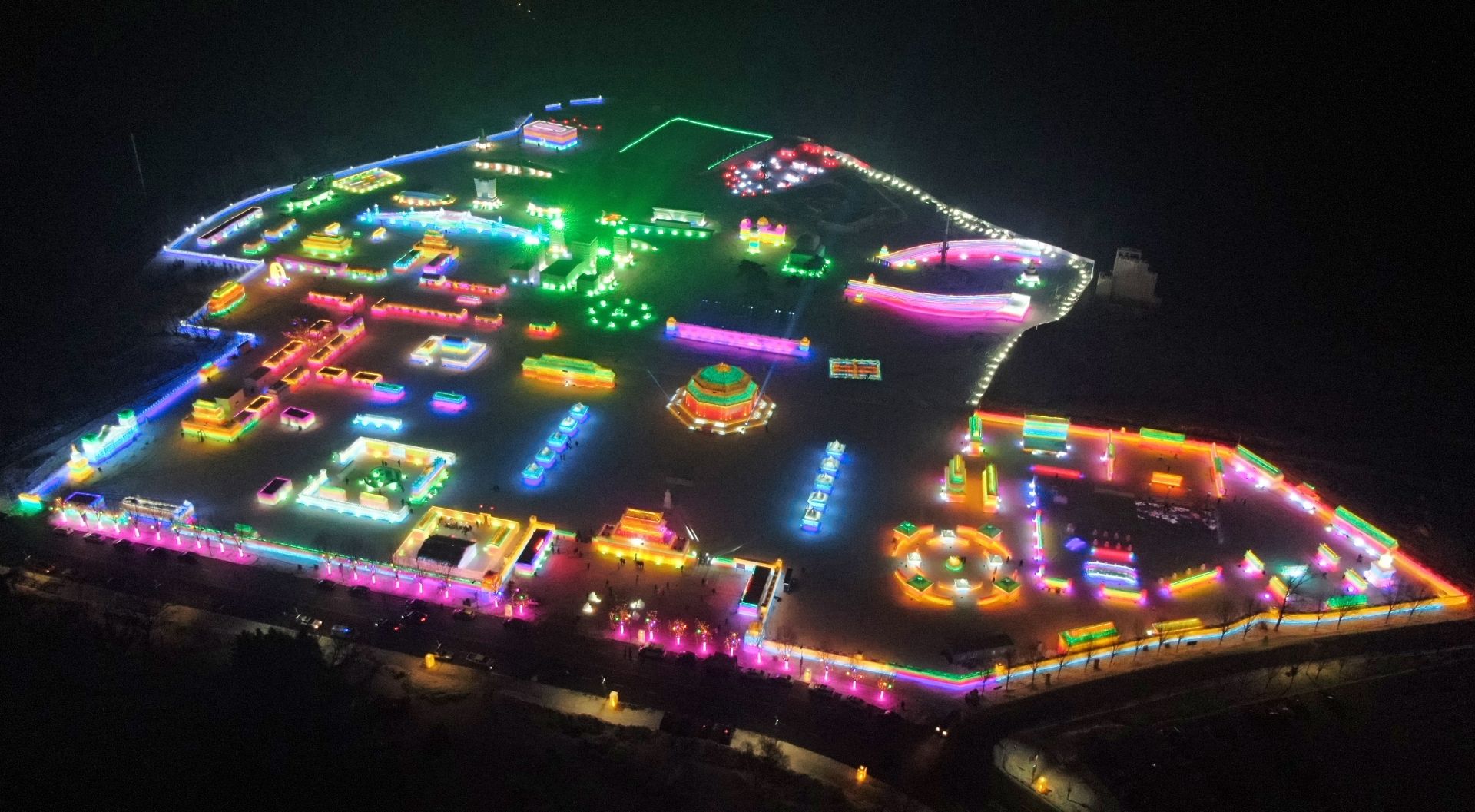 1月9日拍摄的沈阳市棋盘山风景区内“梦幻盛京·冰雪世界”夜景(无人机照片)。 位于辽宁省沈阳市棋盘山风景区内“梦幻盛京·冰雪世界”是沈阳目前规模最大的冰雪雕塑和冰灯展区,用122座冰雕、43座雪雕还原了沈阳众多古迹和地标性建筑,将沈阳的历史文化如梦如幻地呈现在广大市民和游客面前。 新华社记者 杨青 摄