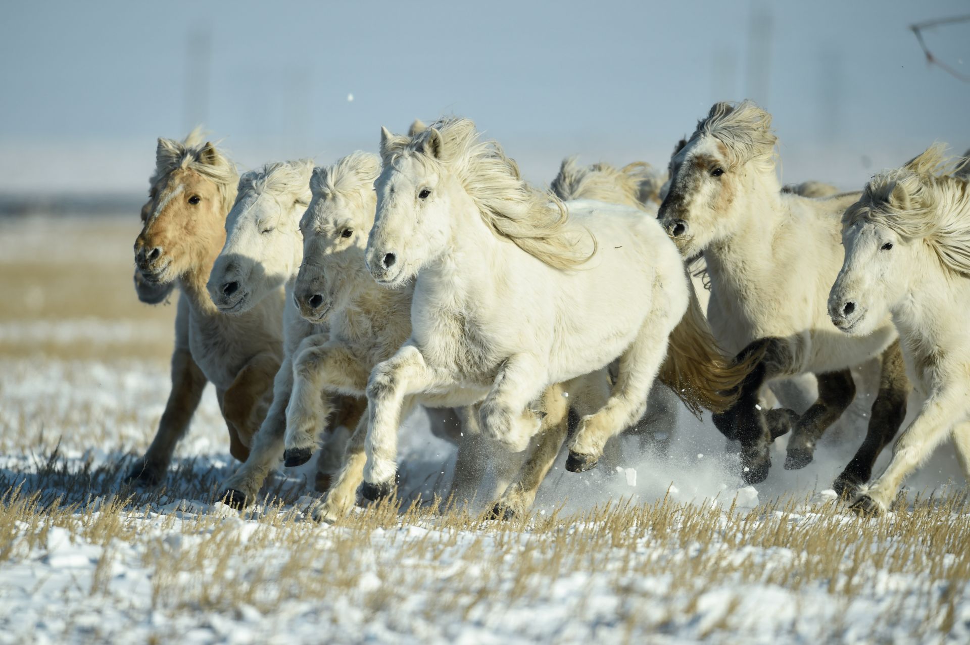 1月12日,凤凰马场的马群在雪原上奔跑。新华社记者 刘磊 摄
