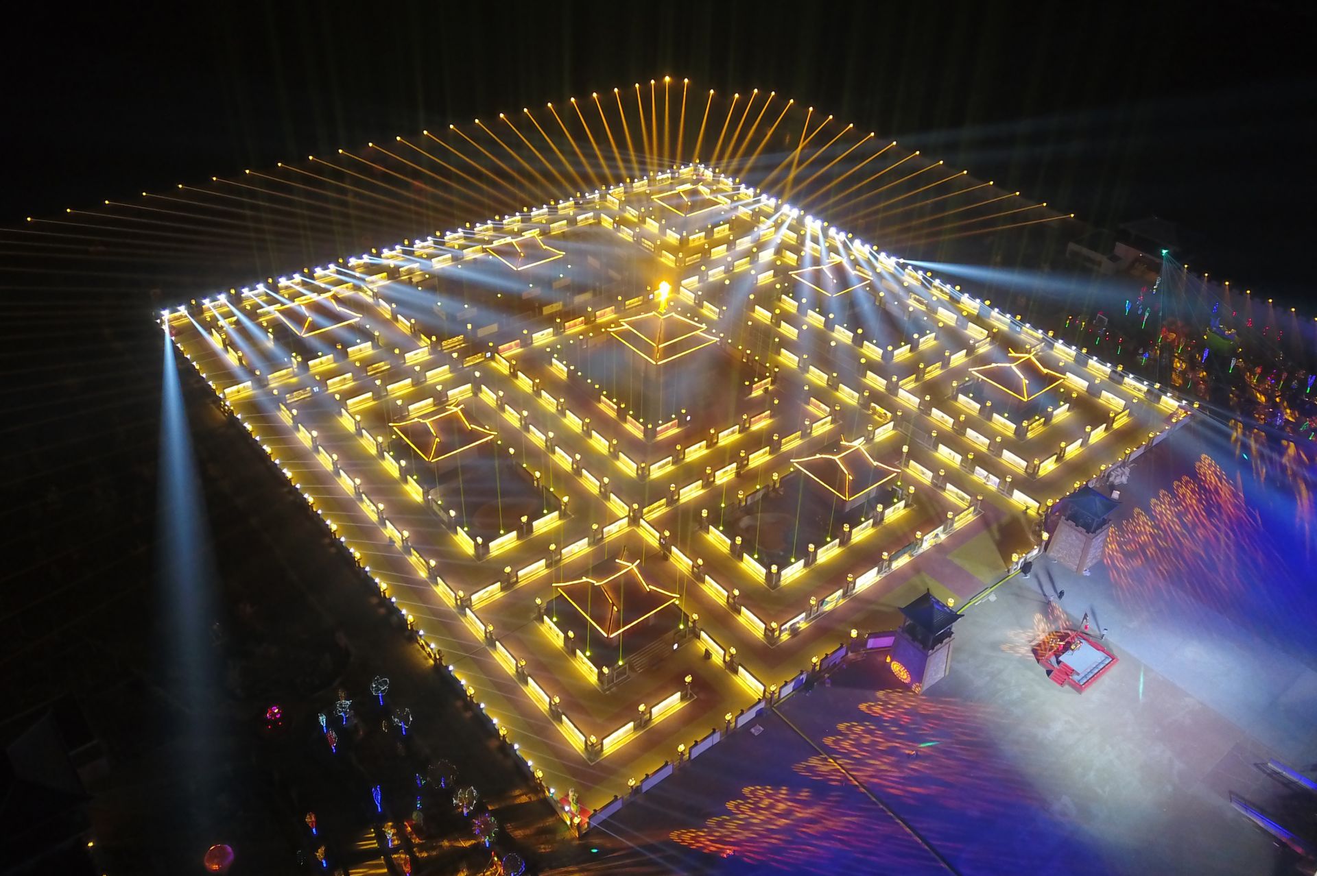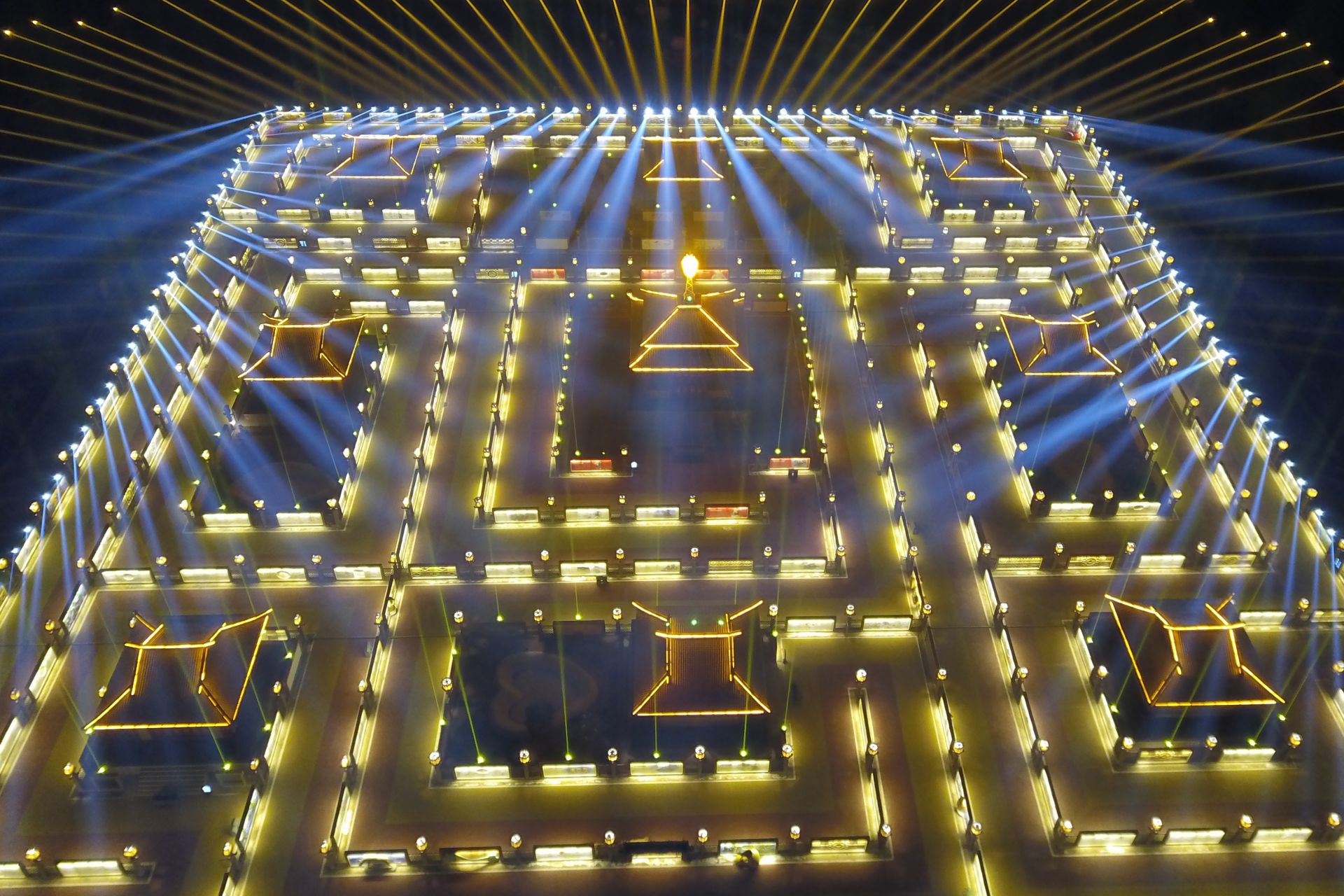 这是1月14日在张掖市甘州区碱滩镇古城村拍摄的九曲黄河灯阵(无人机照片)。 春节临近,位于甘肃省张掖市甘州区碱滩镇古城村的“九曲黄河灯阵”近日完成灯光的安装和调试,将于农历正月初五正式对游客开放。 九曲黄河灯阵起源于黄河沿岸,因灯阵曲折绵延如黄河之龙曲而得名,在流传至张掖后被当地人民保存、继承下来,如今已是这里传承千年的文化遗产。 新华社记者 范培珅 摄