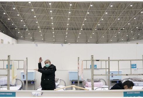 2月10日,在武汉客厅方舱医院,一名患者正在打拳锻炼身体。武汉方舱医院从2月5日收治首批患者以来,运行平稳有序,患者在医护人员的精心照顾下调养身体,等待痊愈。新华社记者 熊琦 摄