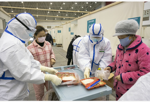 2月10日,在武汉客厅方舱医院,医护人员在分发餐食。武汉方舱医院从2月5日收治首批患者以来,运行平稳有序,患者在医护人员的精心照顾下调养身体,等待痊愈。新华社记者 熊琦 摄