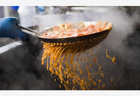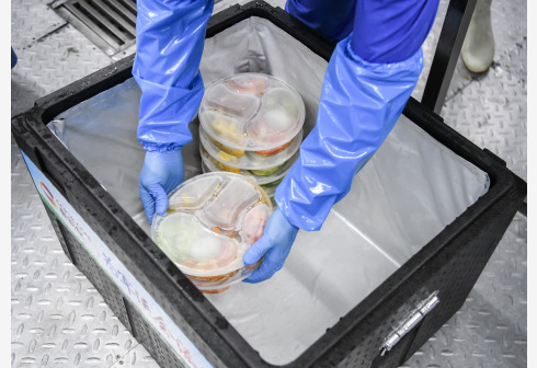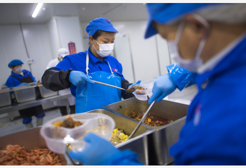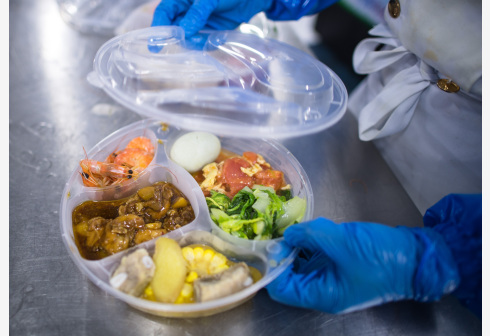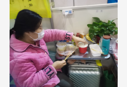 3月6日,在武汉东西湖方舱医院,一位患者在吃午饭。当日,记者来到武汉一家为方舱医院提供餐食的供餐公司,用镜头记录下方舱医院“后厨房”的工作景象。