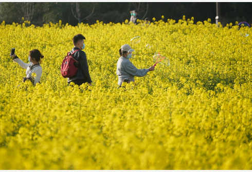 3月14日,游人在南京市江宁区谷里街道徐家院村油菜花田里放松身心。近日,南京市江宁区谷里街道徐家院村约60万株郁金香和近40亩油菜花盛开,美丽的乡村景色让人感受到浓浓的春天气息。新华社记者 季春鹏 摄