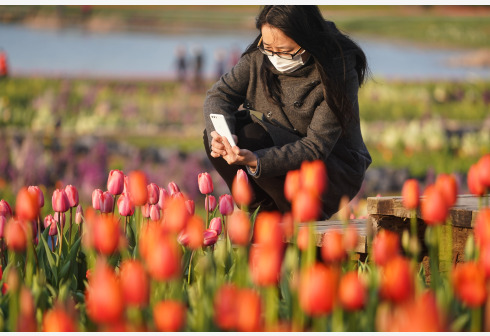 3月14日,游人在南京市江宁区谷里街道徐家院村观赏郁金香。近日,南京市江宁区谷里街道徐家院村约60万株郁金香和近40亩油菜花盛开,美丽的乡村景色让人感受到浓浓的春天气息。新华社记者 季春鹏 摄