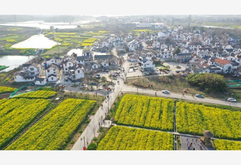 3月14日,南京市江宁区谷里街道徐家院村盛开的油菜花和村舍构成美丽的图画(无人机照片)。近日,南京市江宁区谷里街道徐家院村约60万株郁金香和近40亩油菜花盛开,美丽的乡村景色让人感受到浓浓的春天气息。新华社记者 季春鹏 摄